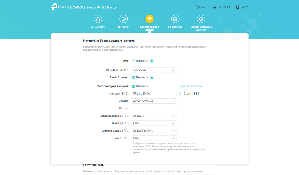 Базовые настройки беспроводных сетей стандартны — имя, безопасность, канал, режим и так далее. Есть возможность использования одного имени сети для разных диапазонов (технология Smart Connect), независимое отключение диапазонов и запрет трансляции SSID. Обратим здесь внимание на то, что в диапазоне 5 ГГц есть только каналы 36—48, 52—64 и 100—128, что вызвано требованиями европейских регуляторов. Из интересного здесь — возможность создания независимых гостевых сетей и сетей для устройств интернета вещей. При этом первые имеют отдельный диапазон IP-адресов и не могут без разрешения общаться с клиентами в основной сети, а вторые просто подключаются с другими настройками Wi-Fi к основной сети. По замыслу разработчиков, это позволяет повысить совместимость без ущерба производительности и защите основной сети.