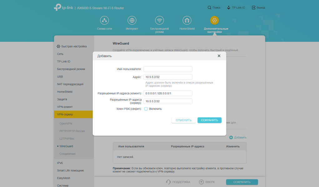 В роутере предусмотрен встроенный клиент VPN с поддержкой протоколов OpenVPN, WireGuard, PPTP и L2TP/IPSec, который можно использовать, например, для подключения к удаленным сетям. При этом есть возможность выбора конкретных клиентов локальной сети, которые будут работать через удаленный сервер. Есть и обратный вариант — сервер VPN с теми же протоколами, который обеспечит безопасный доступ к вашей домашней локальной сети.