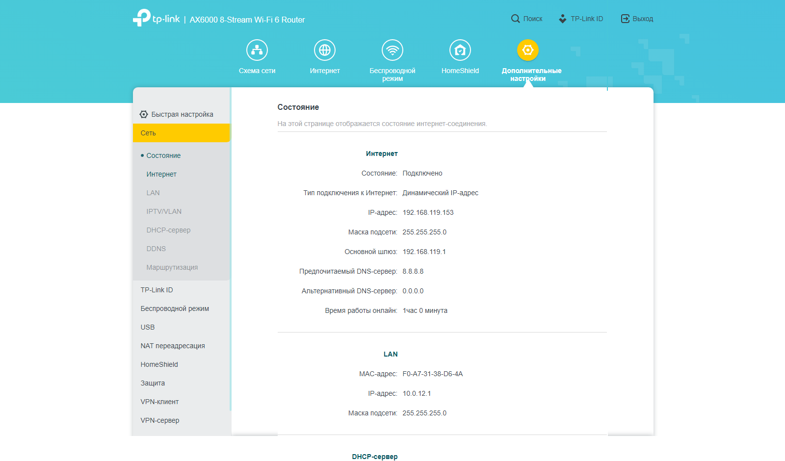 Раздел «Сеть» позволяет настроить подключение к провайдеру, адресацию в локальном сегменте сети, работу с IPTV (выделенный порт для приставки, VLAN, мультикаст). Также есть клиент DDNS и режим агрегации портов LAN2 и LAN3. Если ваш провайдер поддерживает работу с IPv6, то настройки данного протокола находятся ниже в одноименном разделе.