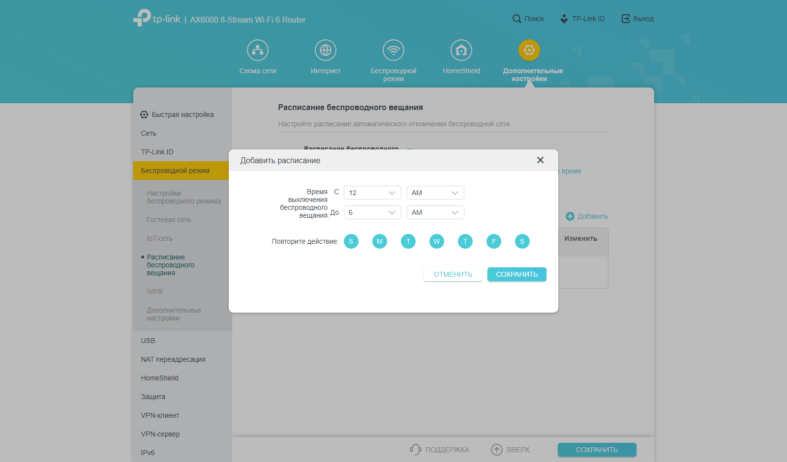 В расширенном варианте настроек беспроводных точек доступа можно выбрать мощность передатчиков, ограничить время работы гостевой сети, настроить общее расписание работы Wi-Fi, активировать WPS.