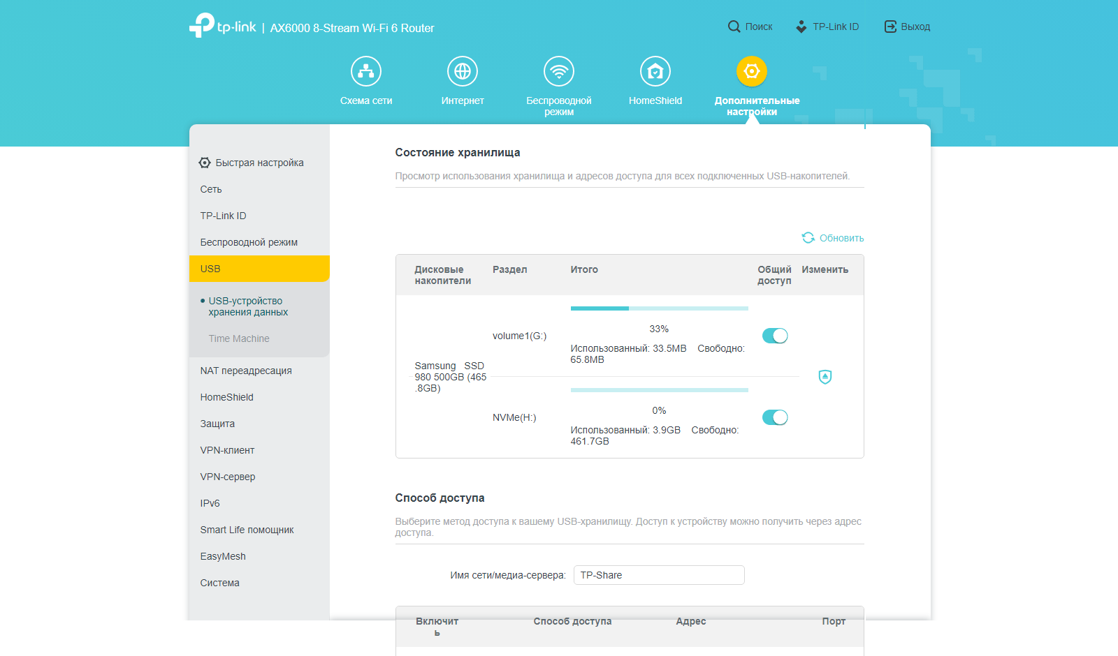 Роутер оборудован портом USB 3.0, который можно использовать для подключения накопителей. Поддерживаются файловые системы FAT32, exFAT, NTFS и HFS+. Доступ к файлам осуществляется по протоколам SMB и FTP, который также можно включить и для WAN. Настройки прав доступа к файлам простейшие — можно только указать два аккаунта — с полным доступом и доступом только на чтение. Настройки относятся ко всем томам сразу. Дополнительно реализованы сервисы медиасервера на базе MiniDLNA и сервера резервных копий Time Machine. Отметим, что поддержка сотовых модемов для подключения к интернету отсутствует.