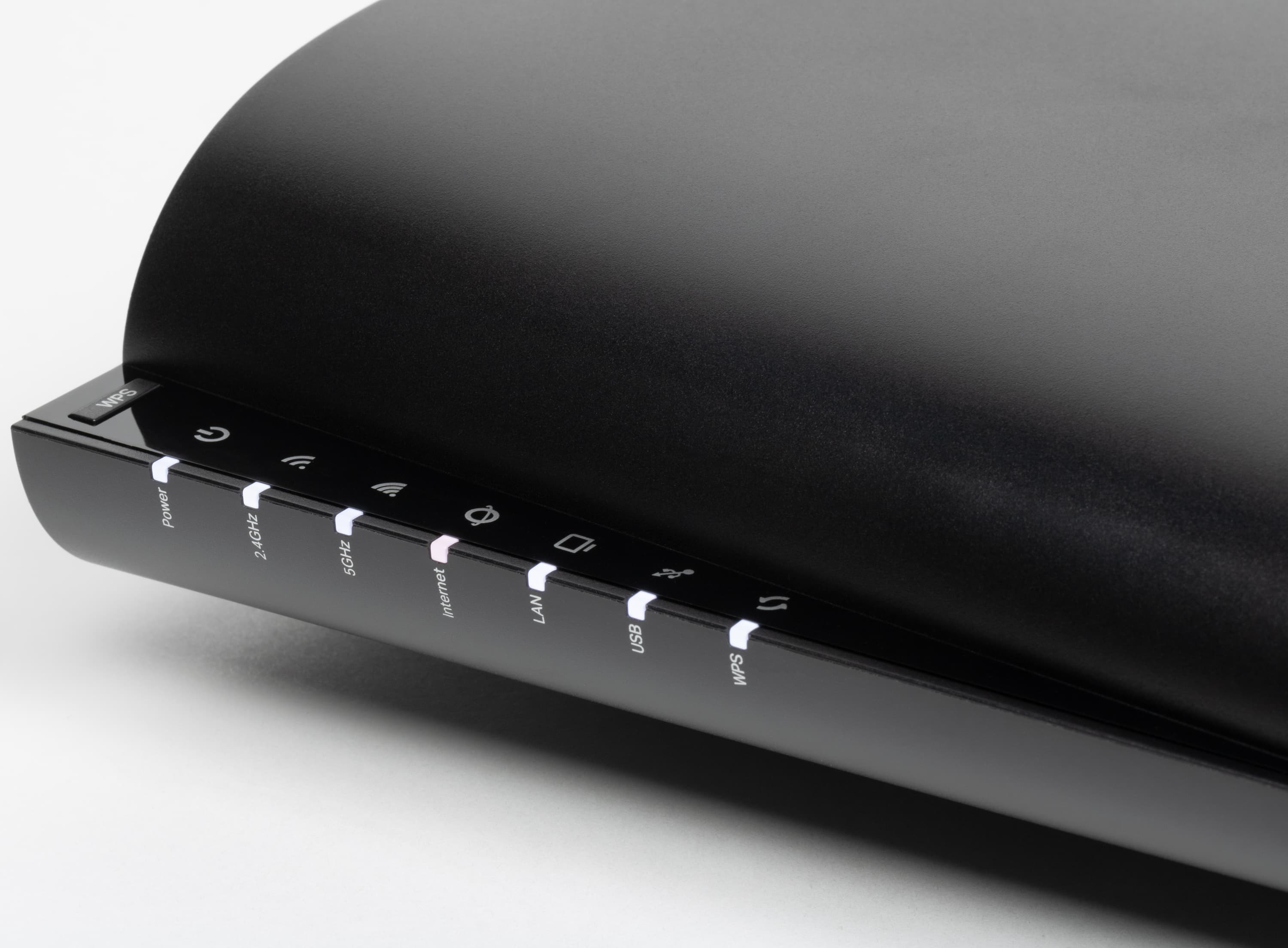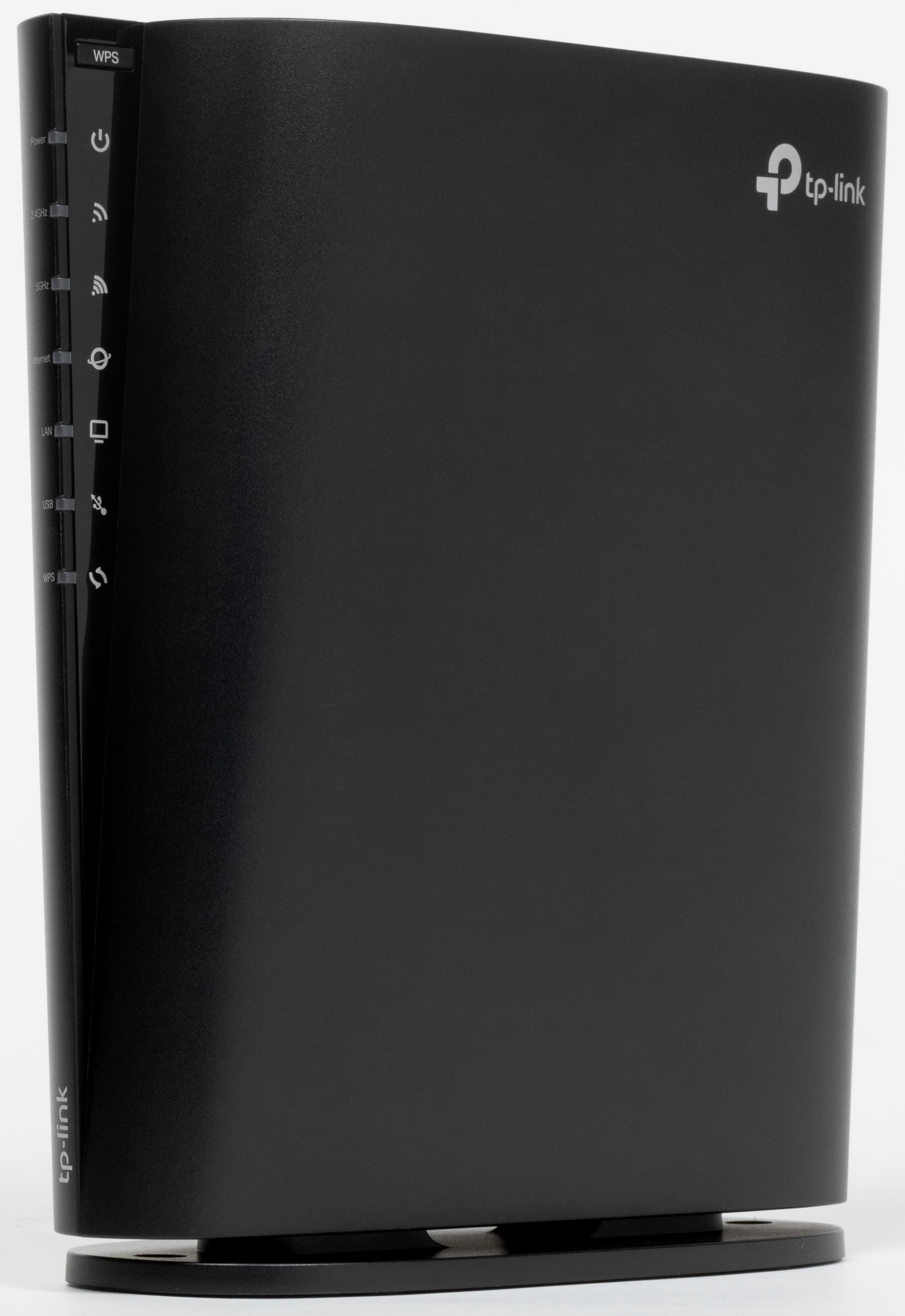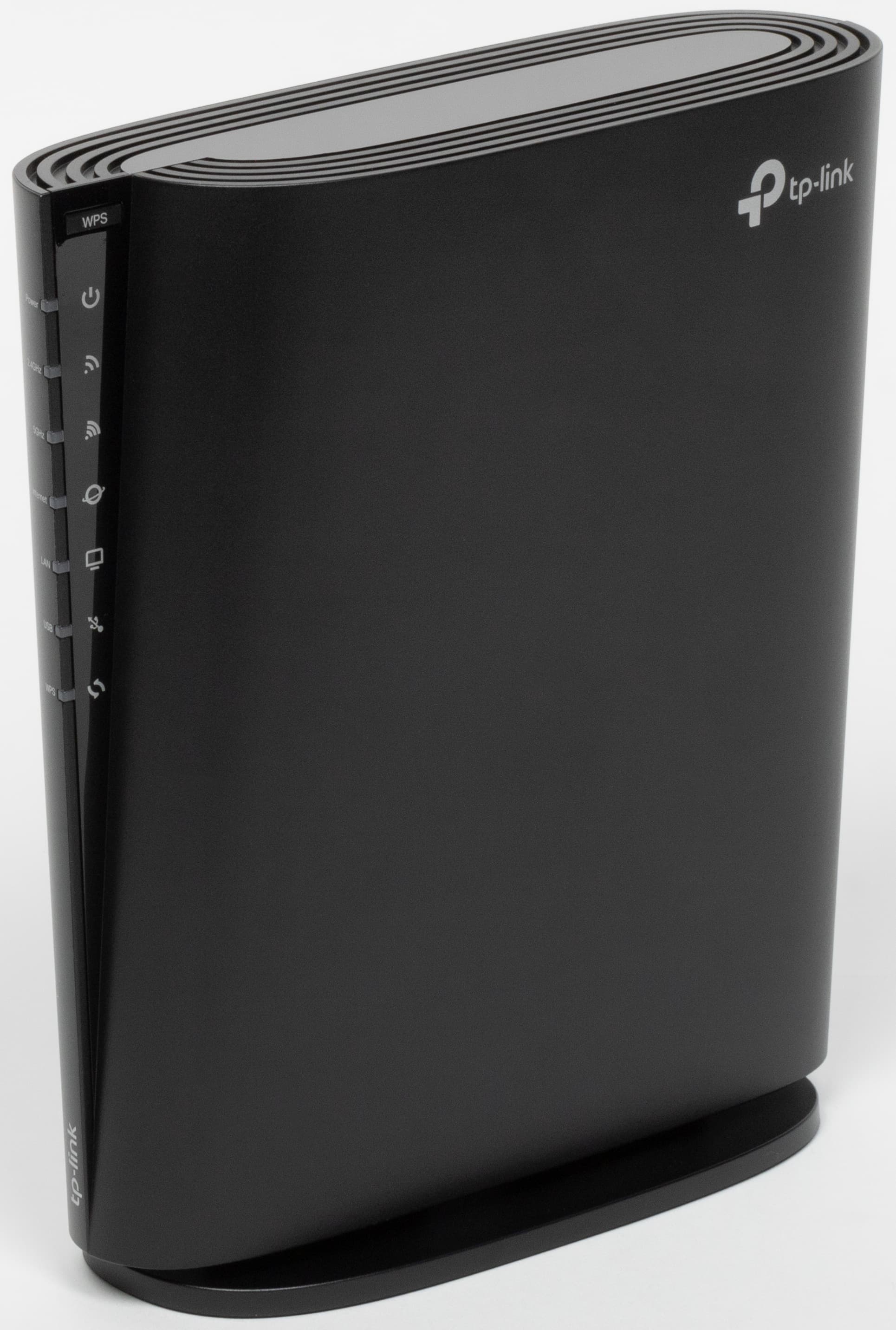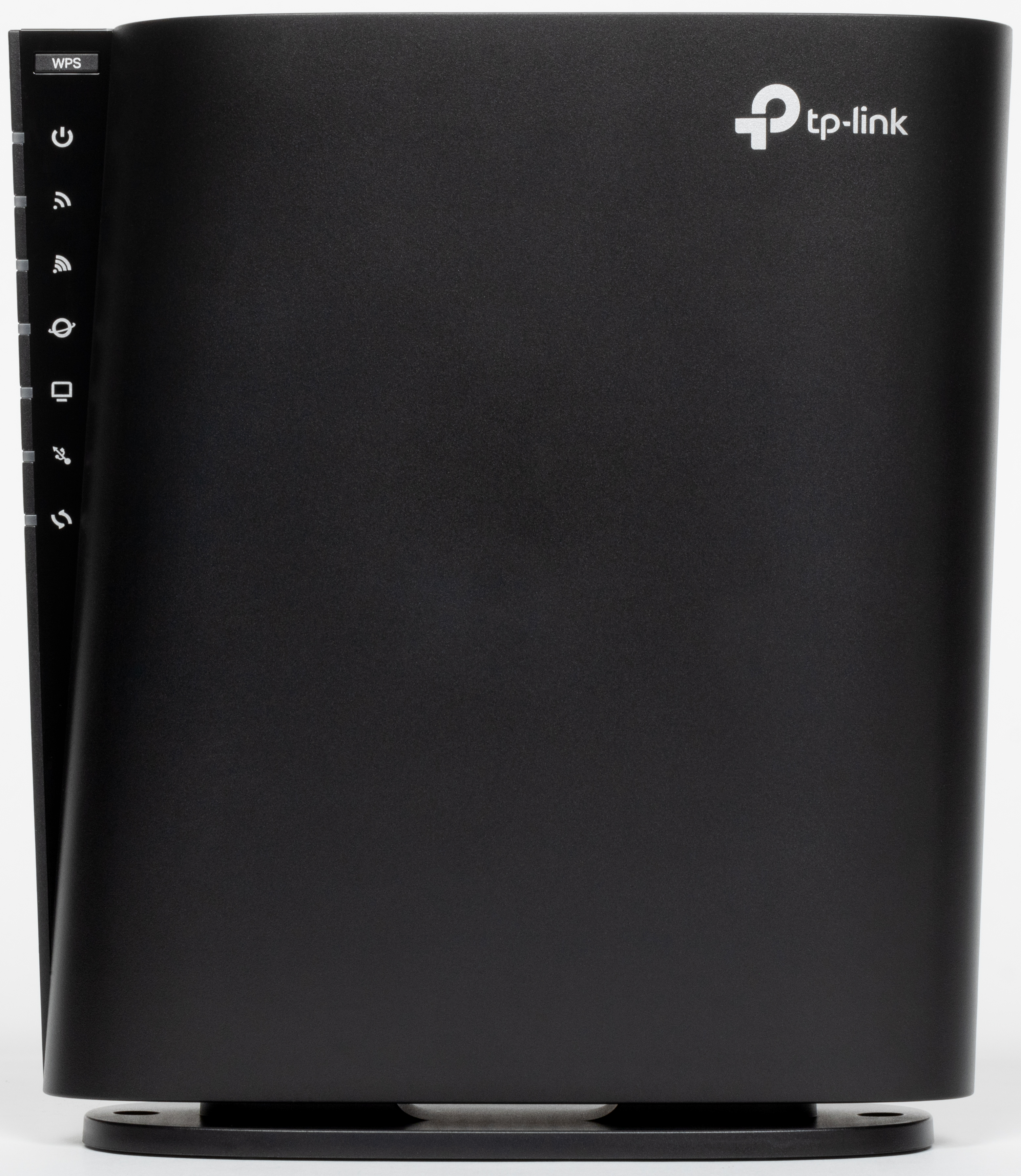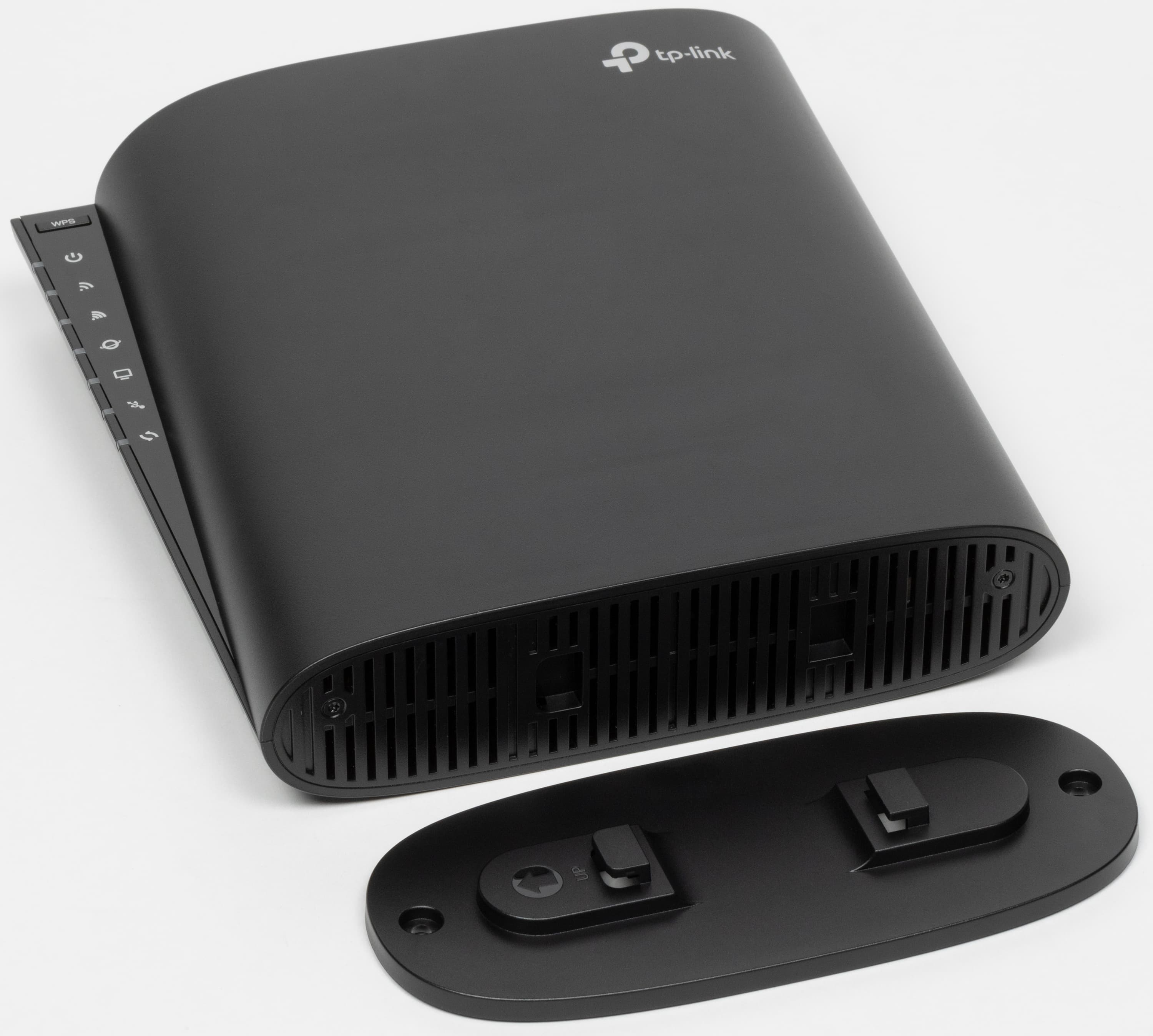 На нижней и верхней поверхностях расположены решетки вентиляции. Слева вертикально идет блок светодиодных индикаторов, в верхней части которого находится кнопка WPS. Светодиоды имеют преимущественно нейтральный белый цвет и не раздражают миганием. В случае отсутствия доступа к интернету соответствующий индикатор горит красным.