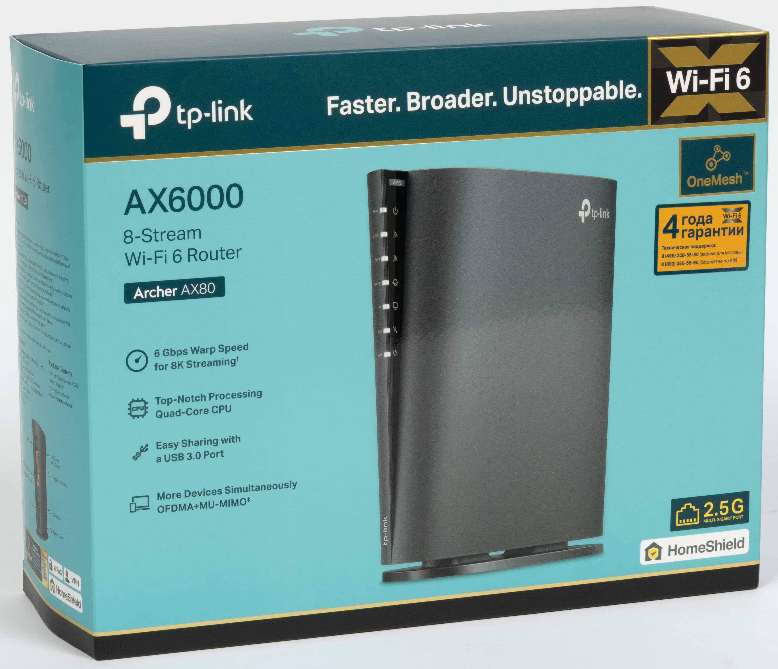 Благодаря новому дизайну корпуса коробка оказалась достаточно компактной. Оформление традиционное для этого производителя. На суперобложке используются фирменные сочетания цветов, глянцевый лак, «золотые» элементы. Внимание акцентируется на поддержке Wi-Fi 6, технологиях OneMesh и HomeShield, наличии порта 2,5 Гбит/с.