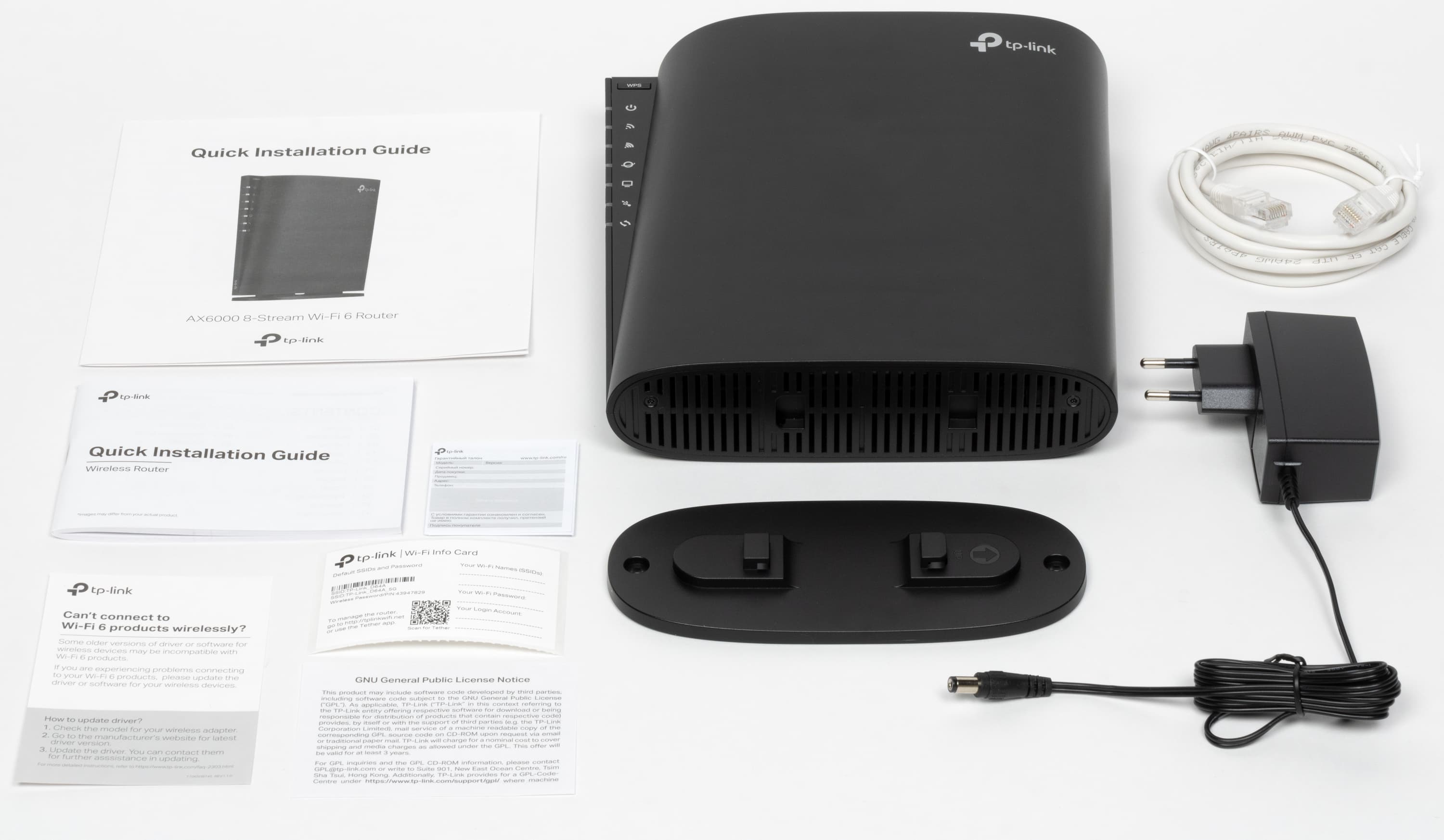 В комплект поставки входят роутер, универсальное крепление, блок питания 12 В 2 А с кабелем длиной 1,5 м и стандартным круглым штекером, серый патч-корд категории 5E длиной 1,2 м, листовка на английском языке по началу работы, повторяющая ее по содержанию многоязычная (русский присутствует) книжка, гарантийный талон и несколько дополнительных листовок.