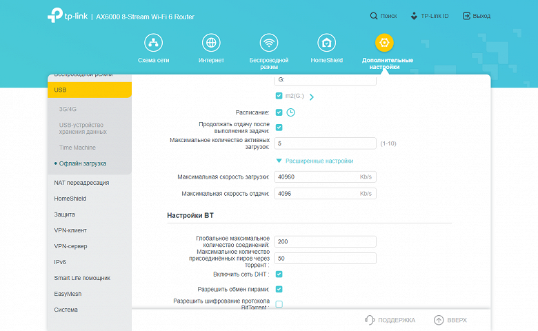 Вариантов работы с USB-накопителями больше: сервер с общими файлами с доступом по протоколам SMB и FTP, сервер резервных копий Apple Time Machine, медиасервер DLNA, автономная загрузка файлов из сетей p2p.