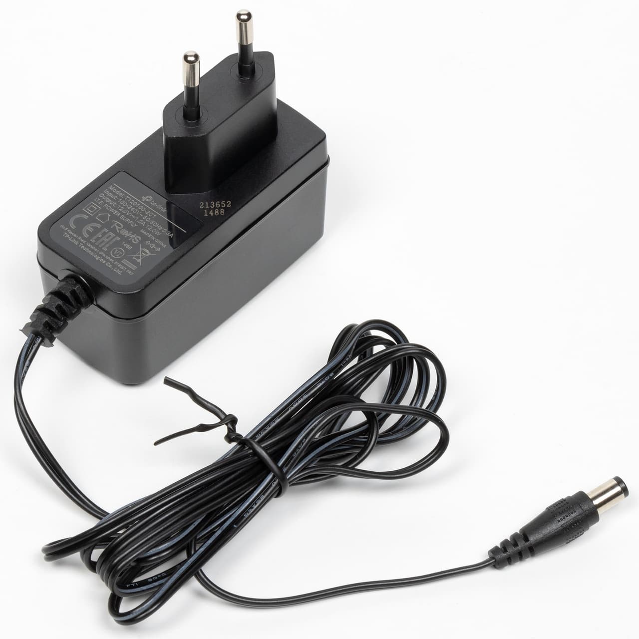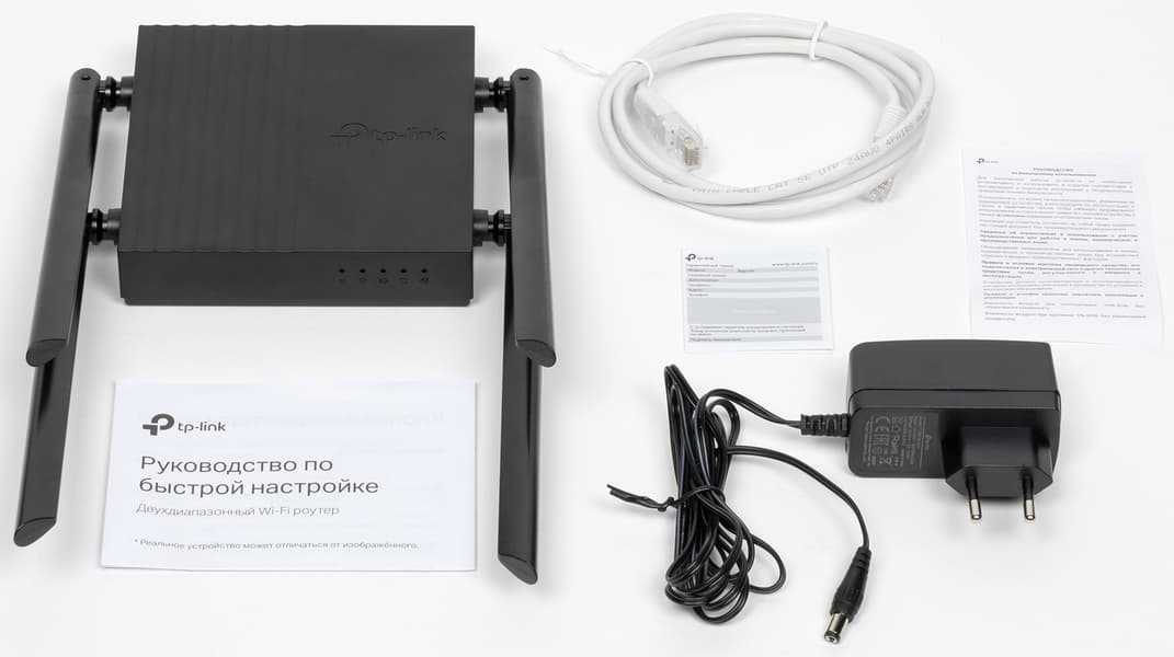 В комплект поставки входят блок питания, патч-корд и немного документации. Блок питания имеет стандартный формат для установки в розетку. Характеристики — 12 В 1 А. Кабель длиной 1,5 м заканчивается круглым штекером 5,5 мм. Патч-корд неожиданно белого цвета, гигабитный, длина составляет 1,1 м.