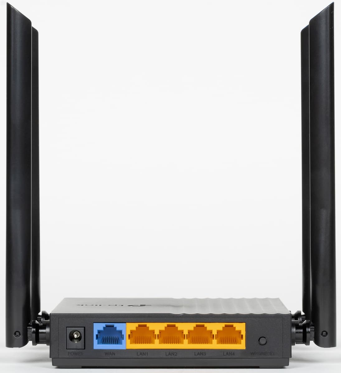 Сзади находятся порты и кнопки — вход блока питания, один порт WAN и четыре порта LAN, кнопка WPS/сброс. Отметим, что порты без индикаторов состояния и активности. Светодиод LAN горит при наличии хотя бы одного подключения к портам LAN.