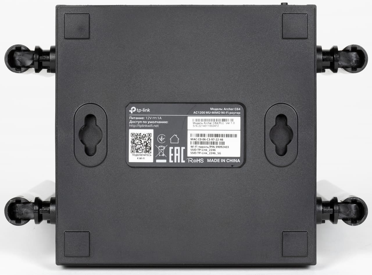 Также на дне можно заметить информационную наклейку с серийным номером, MAC-адресом, именем и паролем беспроводных сетей (в виде текста и QR-кода). Отметим, что последние уникальны для каждого устройства, так что у вас «из коробки» будет сразу защищенная беспроводная сеть.