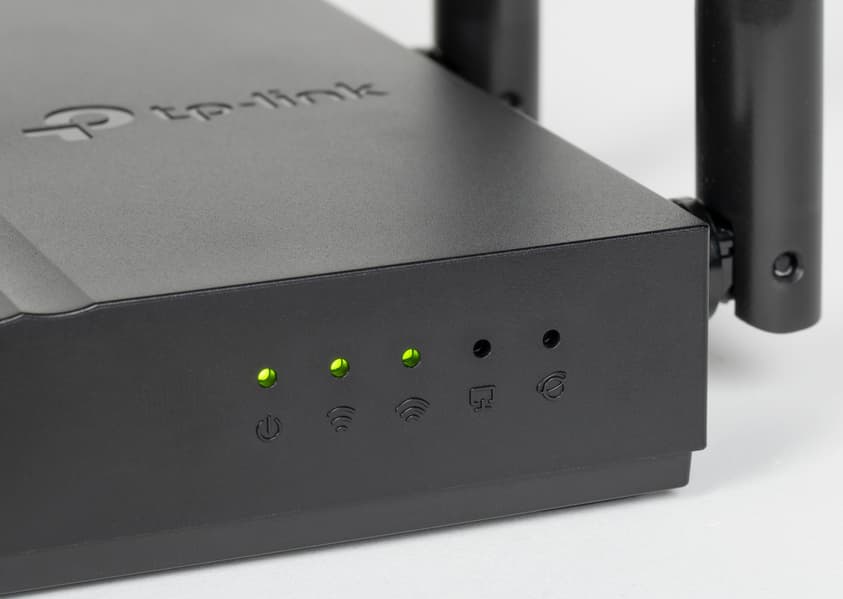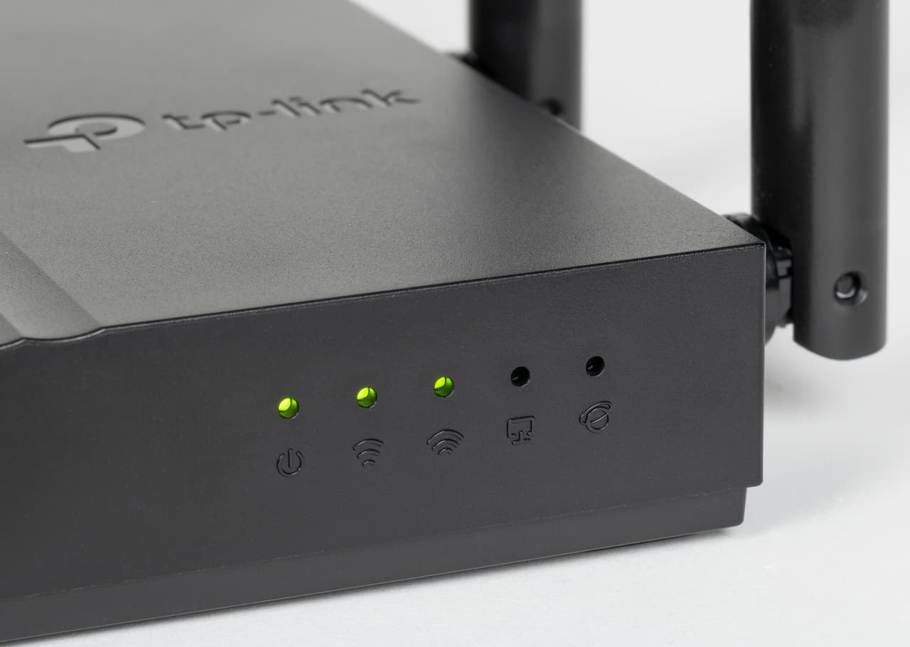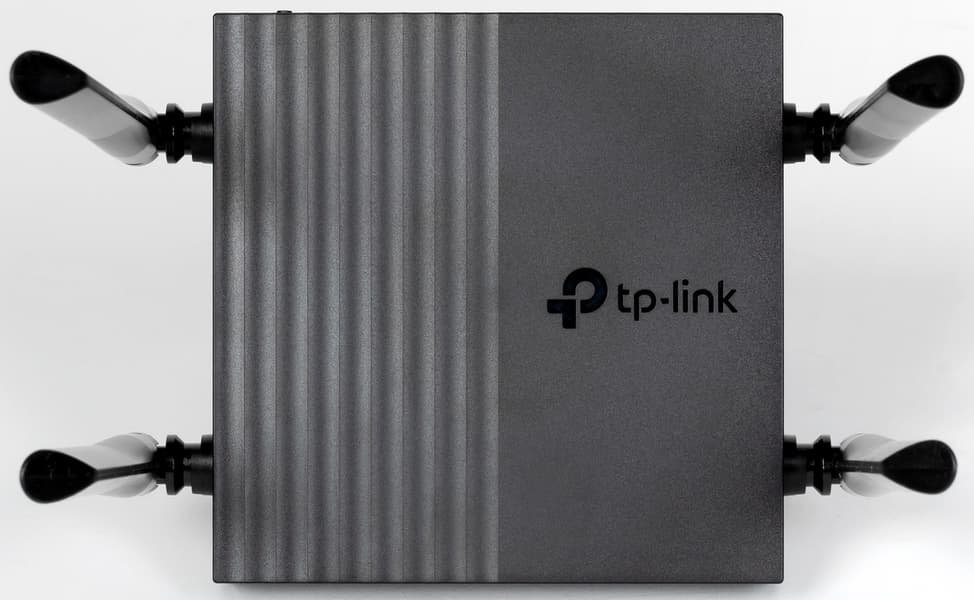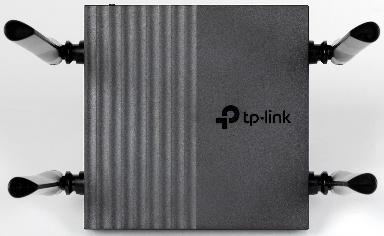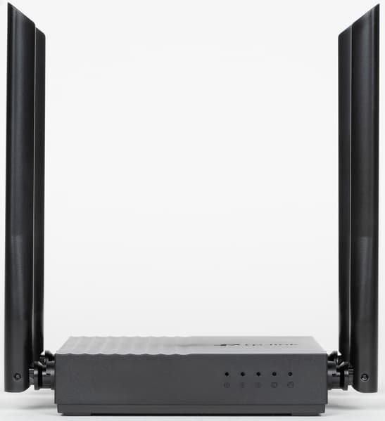 На боковых торцах корпуса установлены антенны. В правой части переднего торца разместили пять светодиодов для контроля состояния устройства — питание, Wi-Fi 2,4 ГГц, Wi-Fi 5 ГГц, LAN, интернет. В штатном режиме все горят зеленым и не мигают даже при передаче данных.