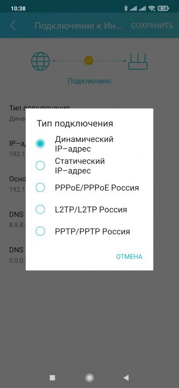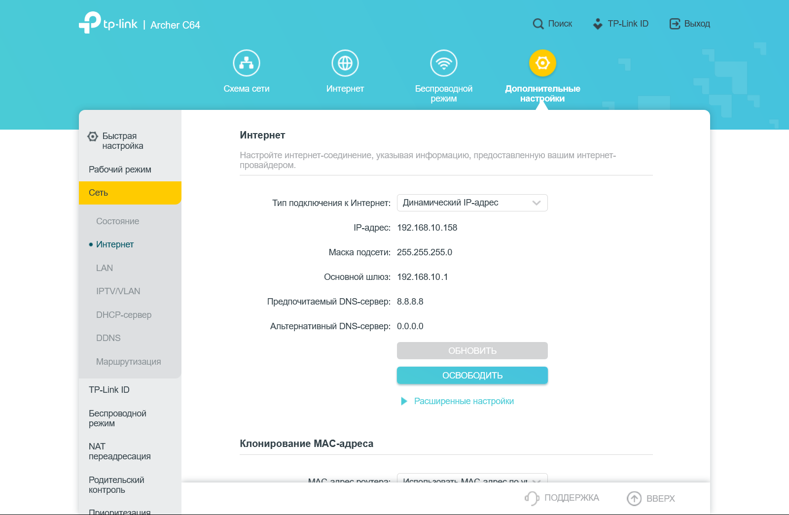 Следующая большая группа — «Сеть». Здесь для контроля еще раз представлен статус подключения к провайдеру. Из типов подключения поддерживаются IPoE, PPPoE, PPTP и L2TP. При необходимости можно изменить MAC-адрес порта WAN и сетевое имя, а также принудительно выбрать скорость порта WAN.
