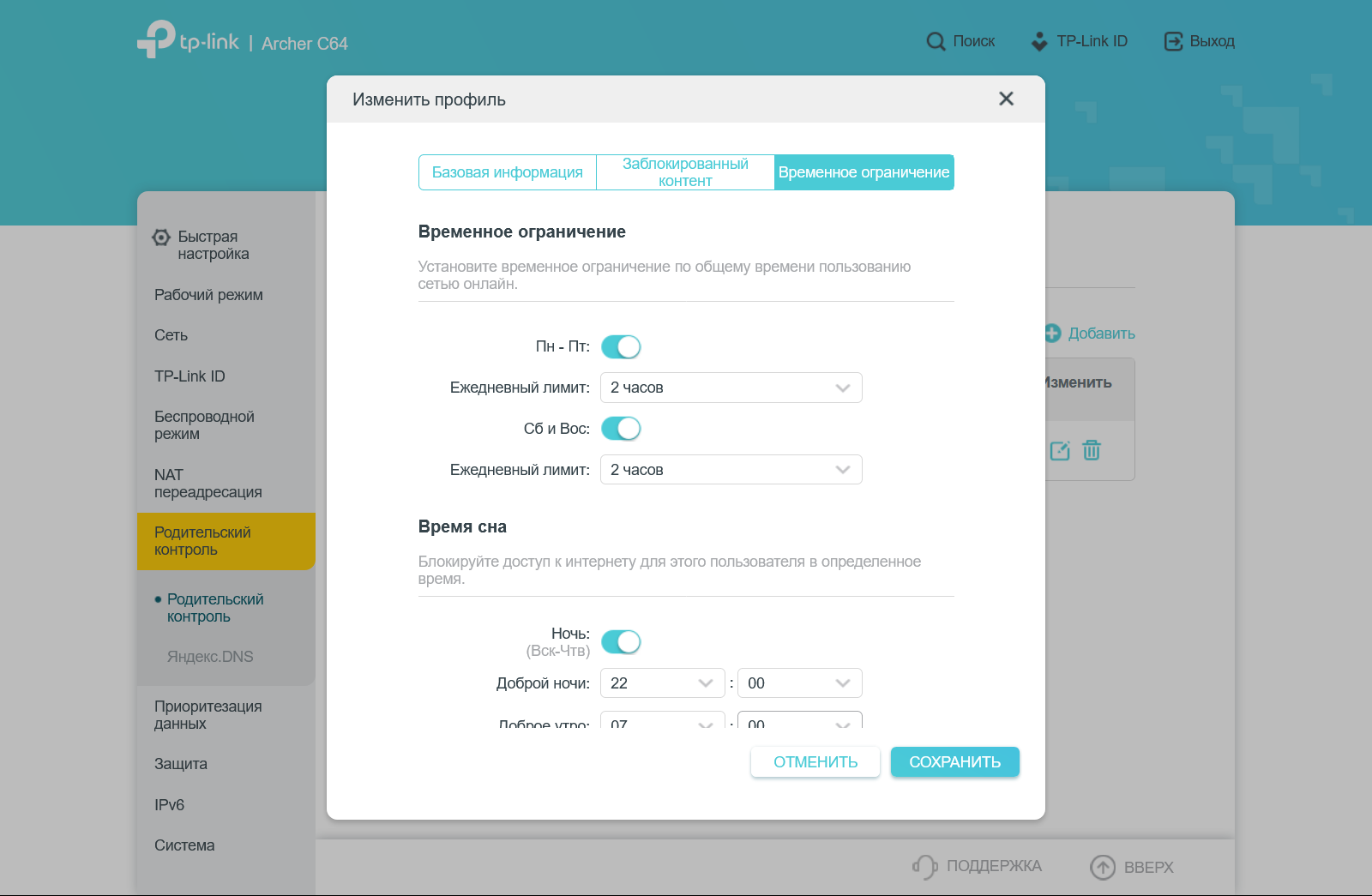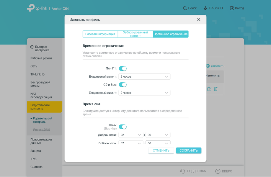 В группе «Родительский контроль» находятся две страницы. На первой настраиваются профили ограничений, которые в дальнейшем можно применить к выбранным клиентам локальной сети. В каждом профиле предусмотрены фильтр сайтов по ключевым словам и ограничения на время работы в сети, а также на доступ в ночное время. Вторая позволяет использовать сервис Яндекс.DNS для устройств локальной сети. При этом для каждого клиента можно установить собственный уровень защиты, а также выбрать уровень для устройств по умолчанию.