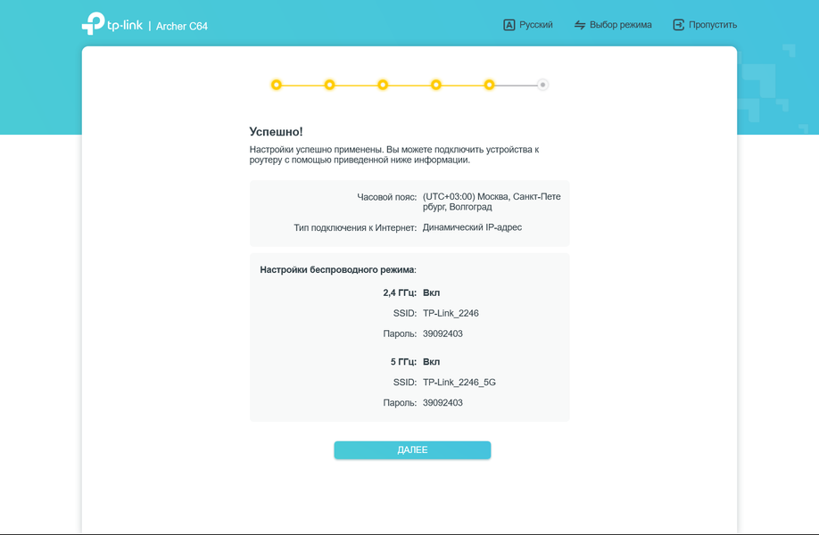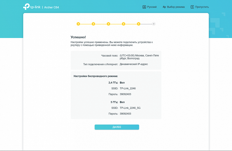 На последней странице предлагается подключить роутер к облачному аккаунту TP-Link для удаленного управления и мониторинга. Отметим, что уже в мастере можно изменить режим работы устройства и превратить роутер в точку доступа.