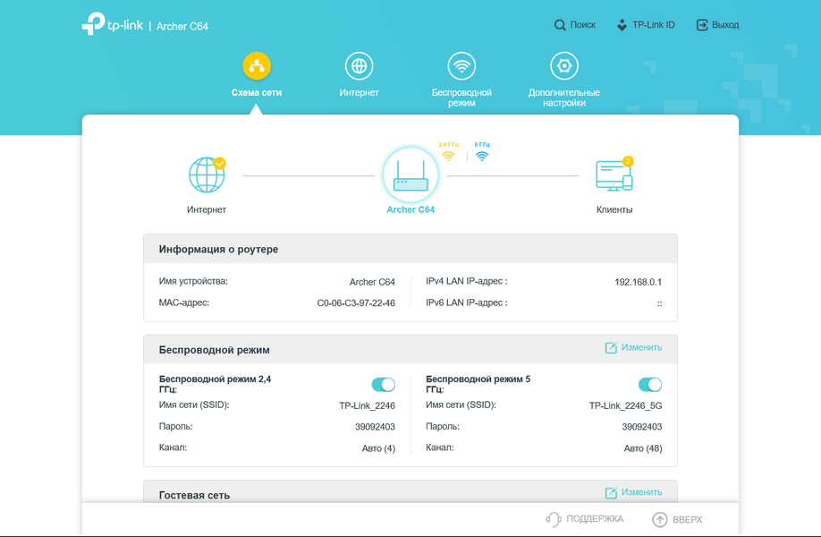 Верхний уровень меню состоит из четырех пунктов. «Схема сети» позволяет оценить текущее состояние подключения к интернету, оперативно включать-выключать беспроводные сети, проверить статус проводных портов (напомним, что индивидуальные физические индикаторы портов сегодня встречаются все реже), посмотреть список текущих клиентов с указанием типов подключения. На последней странице также можно заблокировать нужному клиенту доступ к интернету.