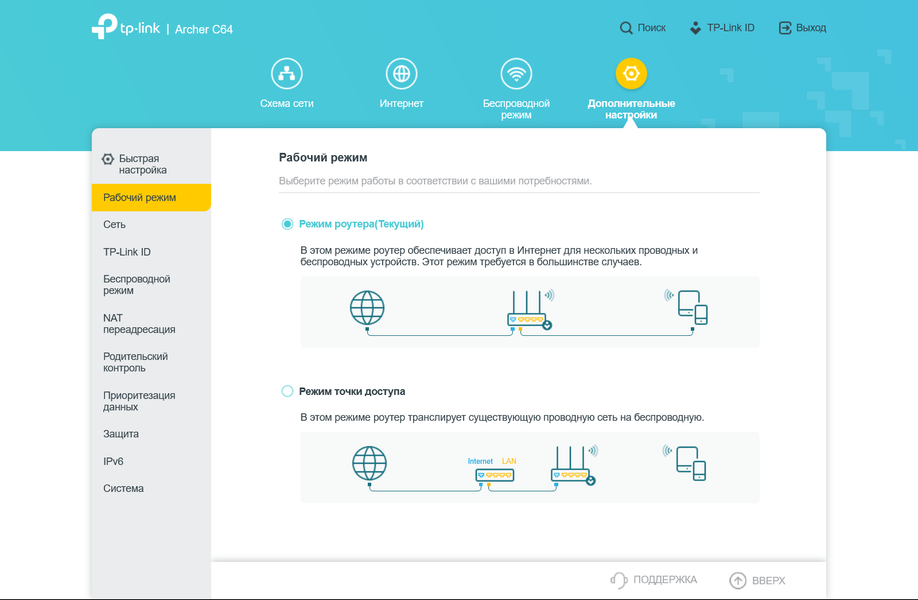 Более детальные параметры собраны в десять групп страниц раздела «Дополнительные настройки». Первым идет пункт выбора рабочего режима — роутер или точка доступа.
