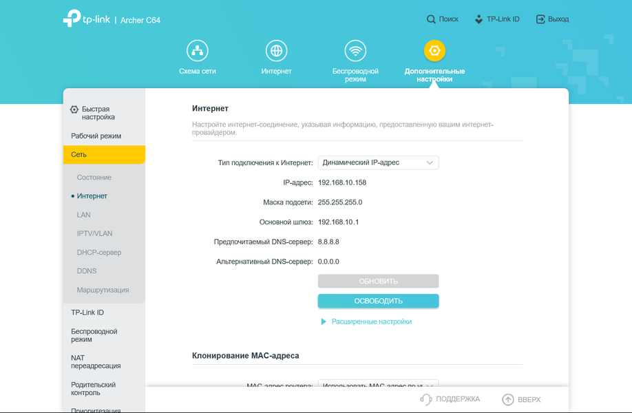 На вкладке «Интернет» можно изменить основные настройки подключения к провайдеру, а на «Беспроводный режим» — имена и пароли беспроводных сетей. Учитывая позиционирование модели, многим пользователям вполне может быть достаточно описанных выше настроек для работы с устройством.