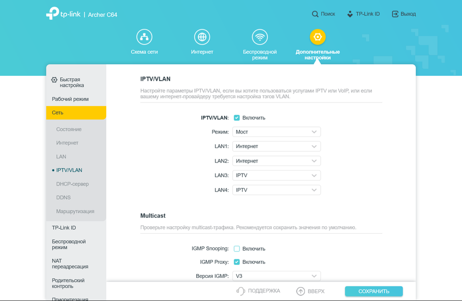 Для приставок IPTV поддерживаются режим моста с выделением физических портов, технология VLAN и протокол мультикаст. Кроме того, есть встроенный клиент DDNS, в котором удобно использовать бесплатный сервис самого производителя, поддержка IPv6, возможность добавления собственных маршрутов, ALG для некоторых популярных протоколов.