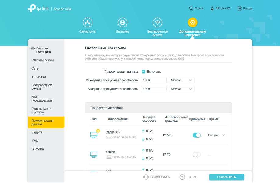 Сервис «Приоритизация данных» позволяет выбрать клиентов локальной сети, которые будут иметь приоритет по трафику. Этот режим можно включить на всегда или на определенный период. Детальных настроек здесь нет, но в целом функция может пригодиться, к примеру, когда на ноутбуке хочется посмотреть онлайн видео, а сетевой накопитель в этот момент что-то активно загружает из интернета.
