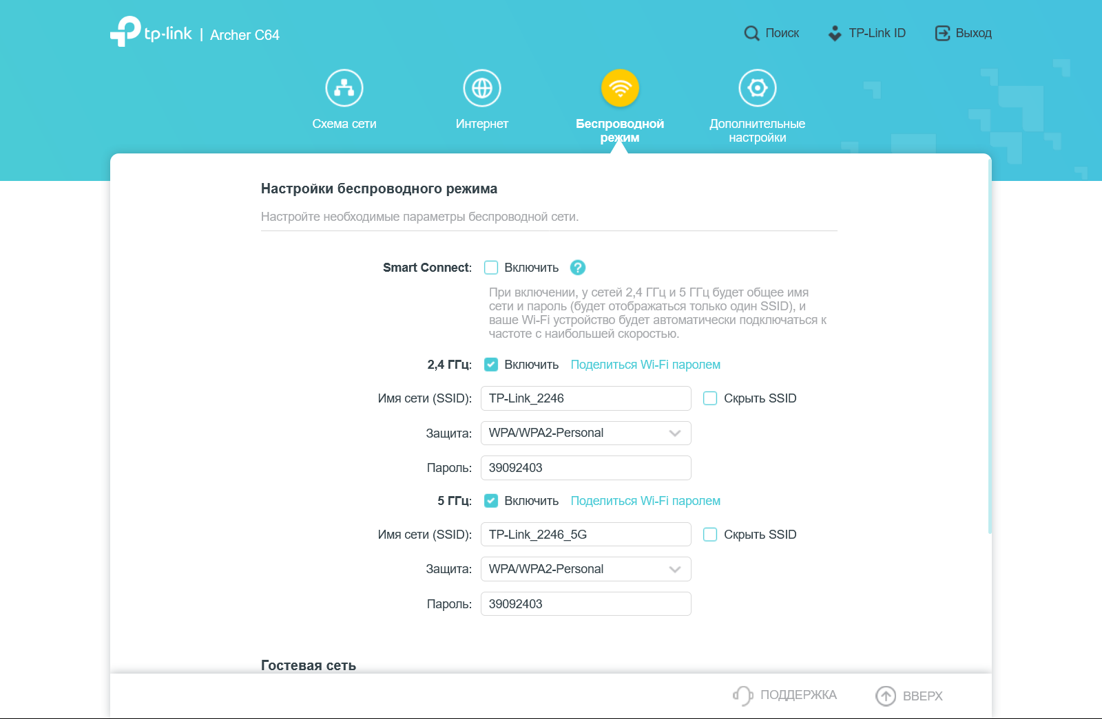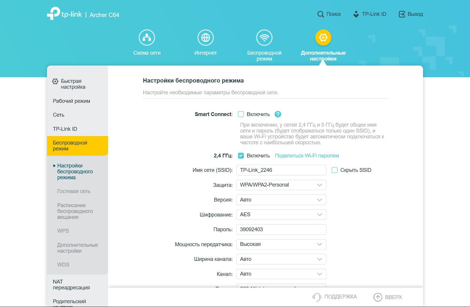 При настройке беспроводных точек доступа есть все привычные параметры — имя сети, пароль, режим защиты, номер канала и шифрование. Кроме того, можно менять мощность передатчиков, организовать гостевые сети, настроить расписание работы точек доступа, использовать функции WPS и WDS. Предусмотрен режим Smart Connect, когда сети в двух диапазонах используют общее имя, а роутер будет предлагать клиенту наиболее выгодный вариант подключения.