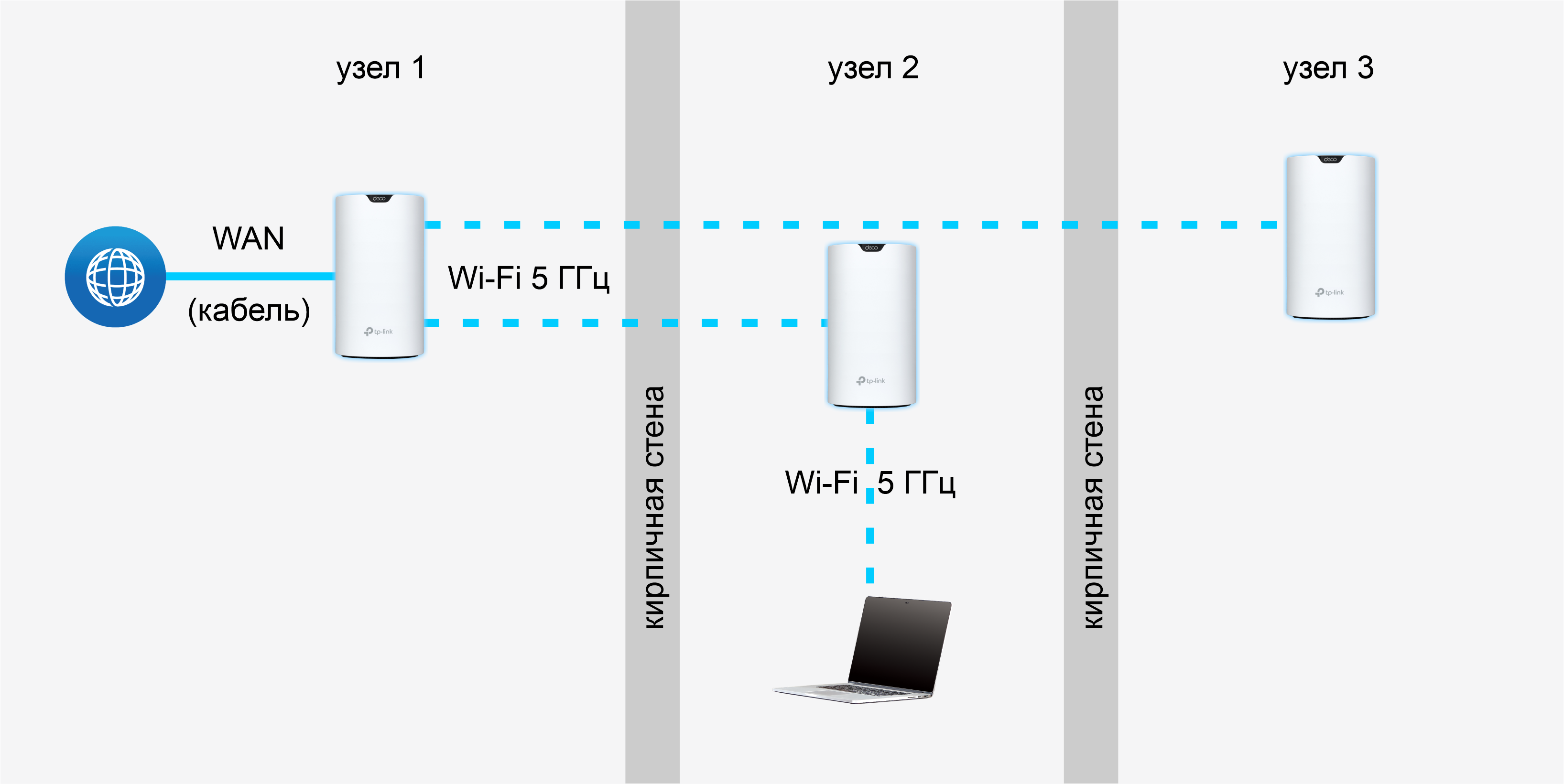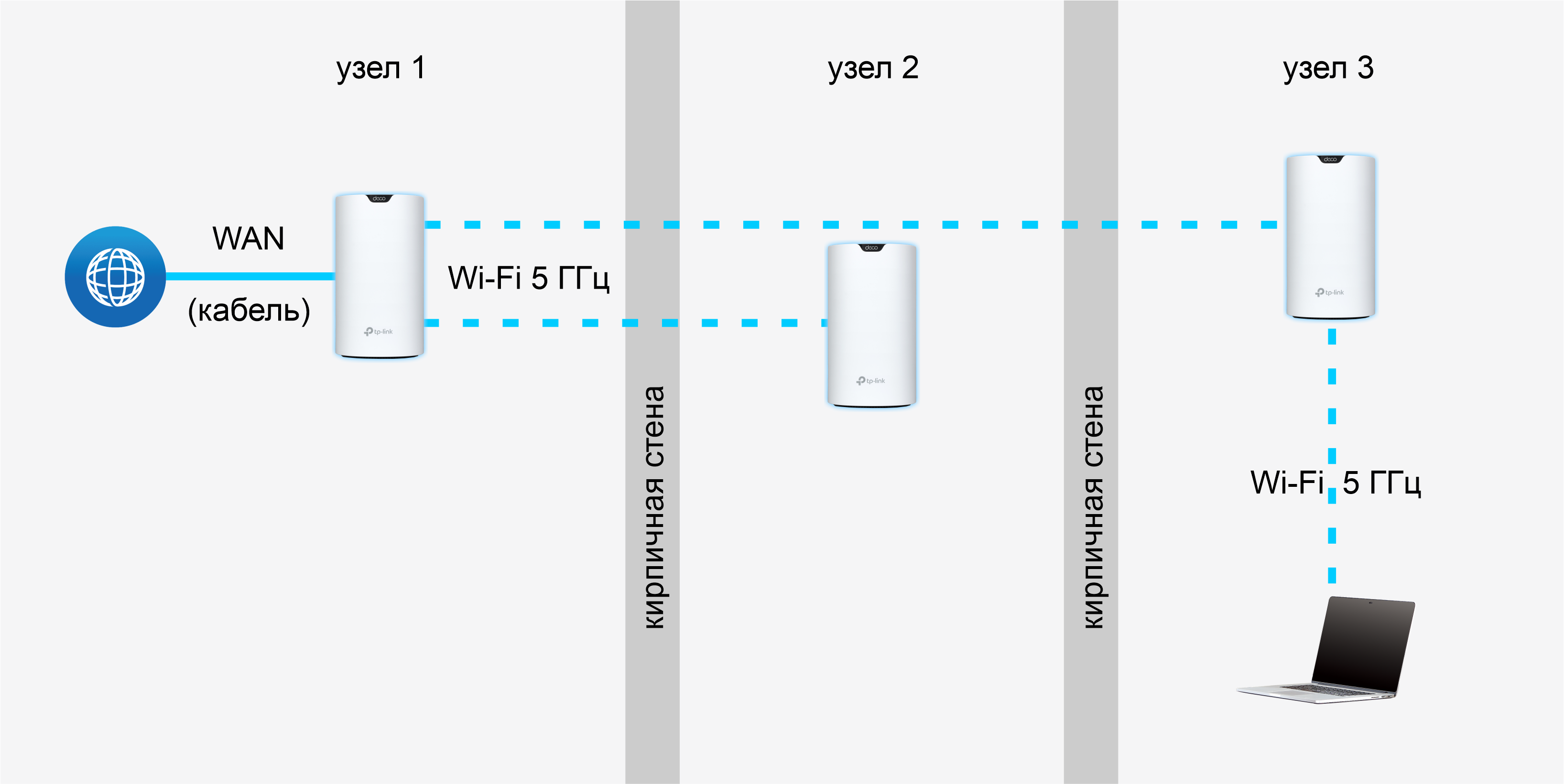 Первая серия экспериментов посвящена оценке скоростей обмена данными в mesh-сети в реальных условиях. Мы реализовали беспроводной коннект клиентских устройств последовательно к каждому из трех узлов. Первый из них является шлюзом между WAN (кабель от терминала провайдера) и внутридомовой LAN, организованной путем подключения двух оставшихся узлов по Wi-Fi 5 ГГц. Мы использовали только этот диапазон, поскольку он обещает максимальные скорости, а задействовать 2,4 ГГц не имеет особого смысла.