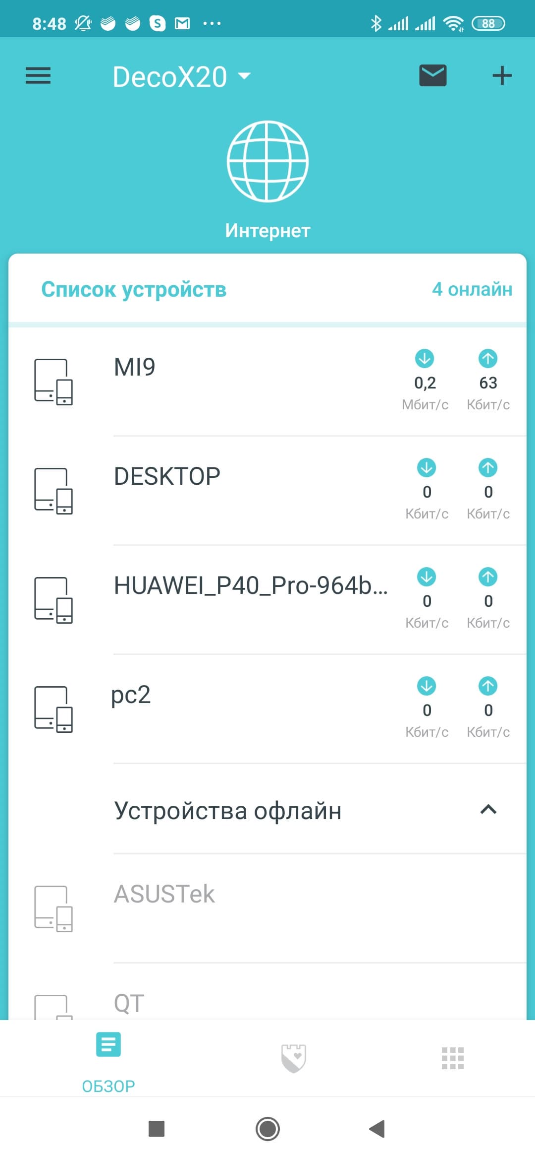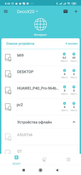 На главной странице программы в режиме «Обзор» отображается статус работы системы в целом (подключения к интернету, состояние дополнительных узлов) и список клиентов. Последние разделены на активные и офлайн. В верхнем левом углу есть знаки конверта, который открывает панель уведомлений, и «+», через который в систему добавляются новые узлы.