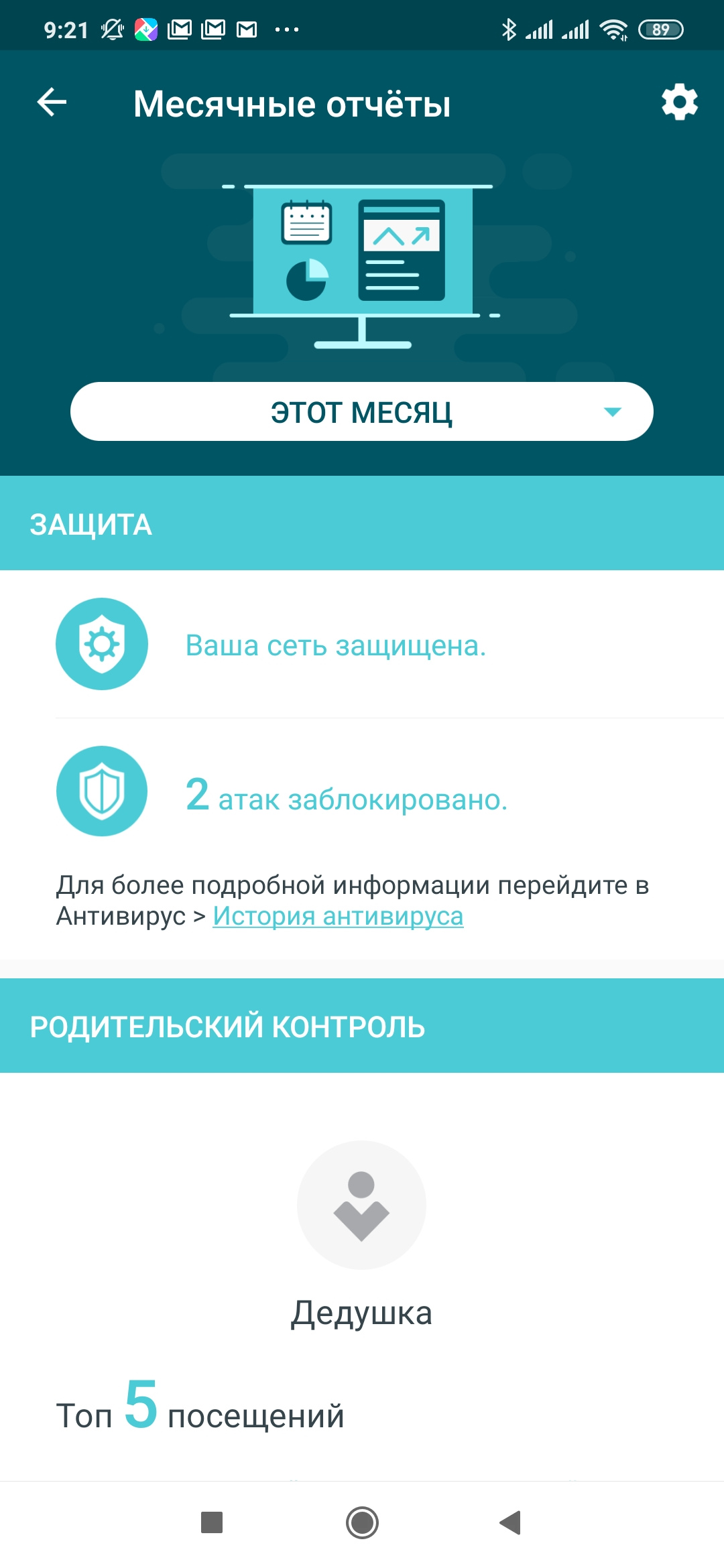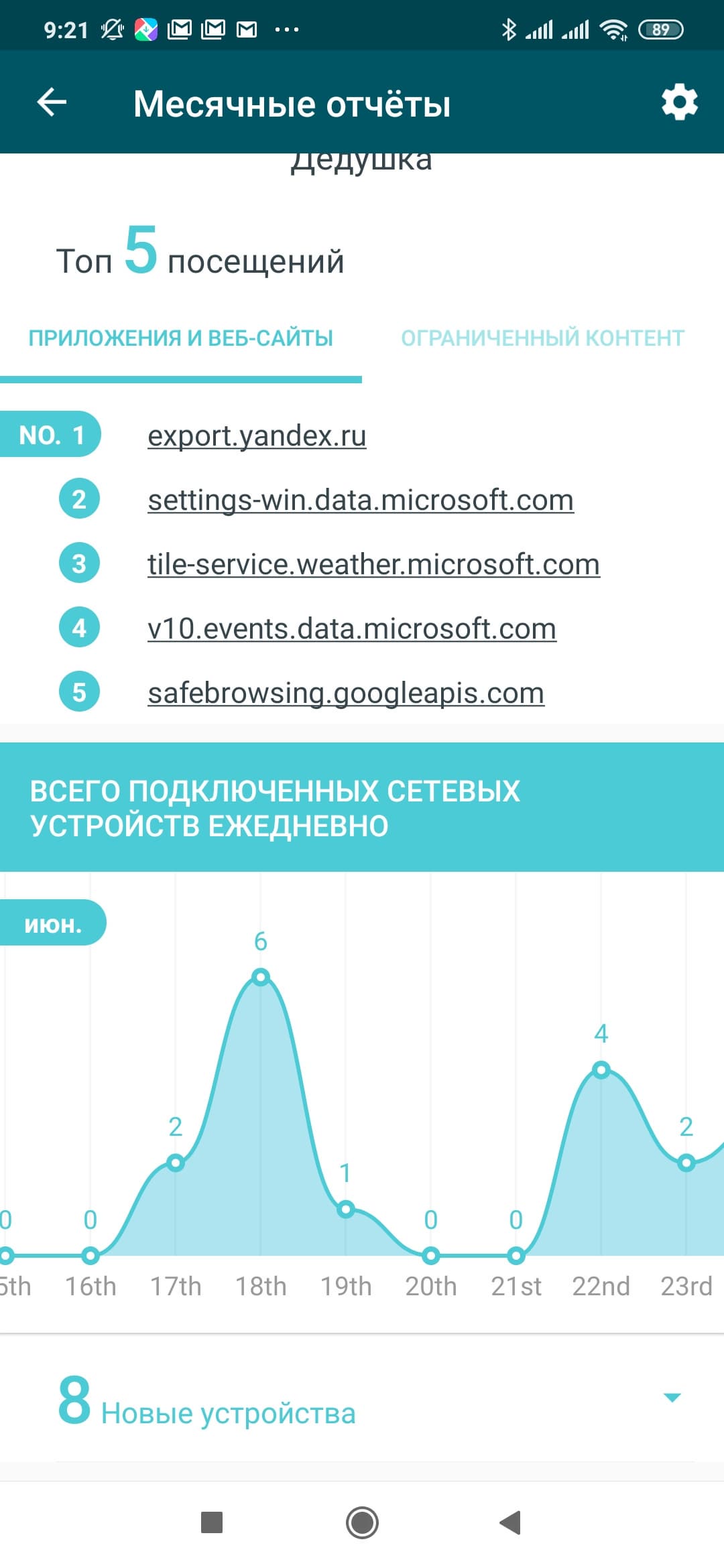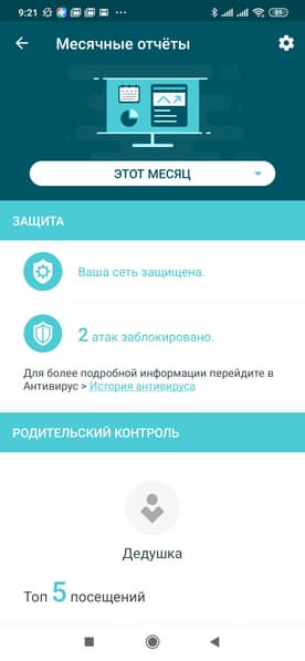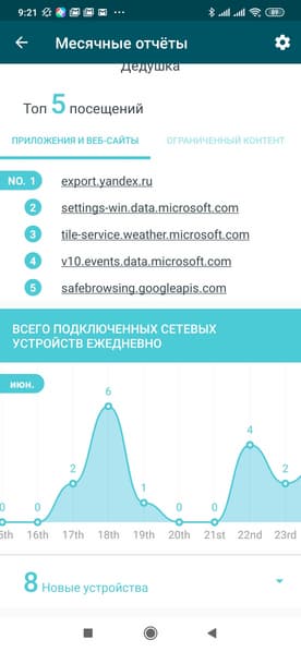 Иконка в левом верхнем углу открывает страницу месячных отчетов (если были включены). На них приводится информация о работе сервиса защиты, а также статистика посещения сайтов устройствами с настроенными профилями, график числа подключенных к сети клиентов по дням, отчет с датами и временем о подключении новых устройств в систему.