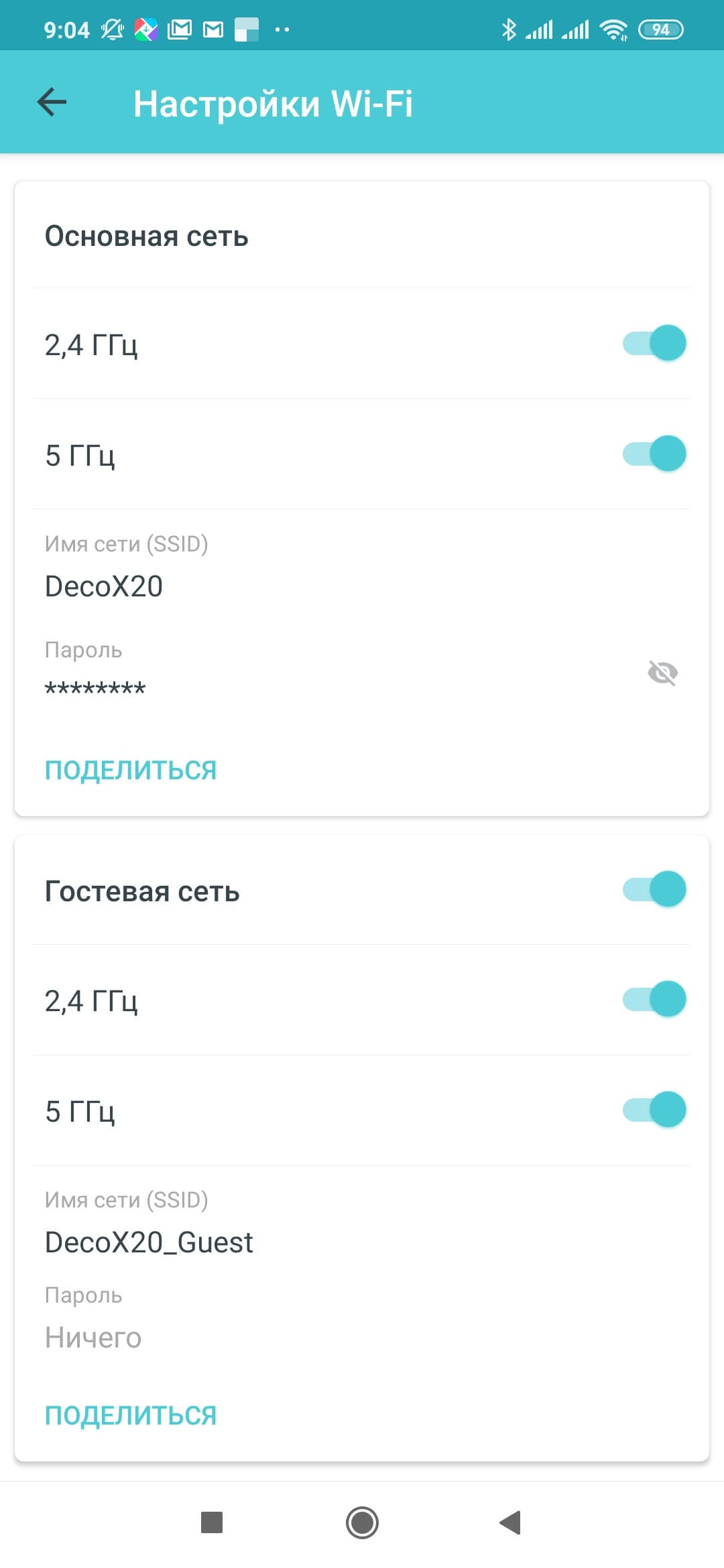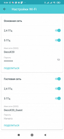 Для беспроводных сетей можно независимо выключать диапазоны 2,4 ГГц и 5 ГГц. Имя сети у них и пароль в любом случае одинаковое. Также на этой странице можно включить гостевые точки доступа с собственным именем и паролем.