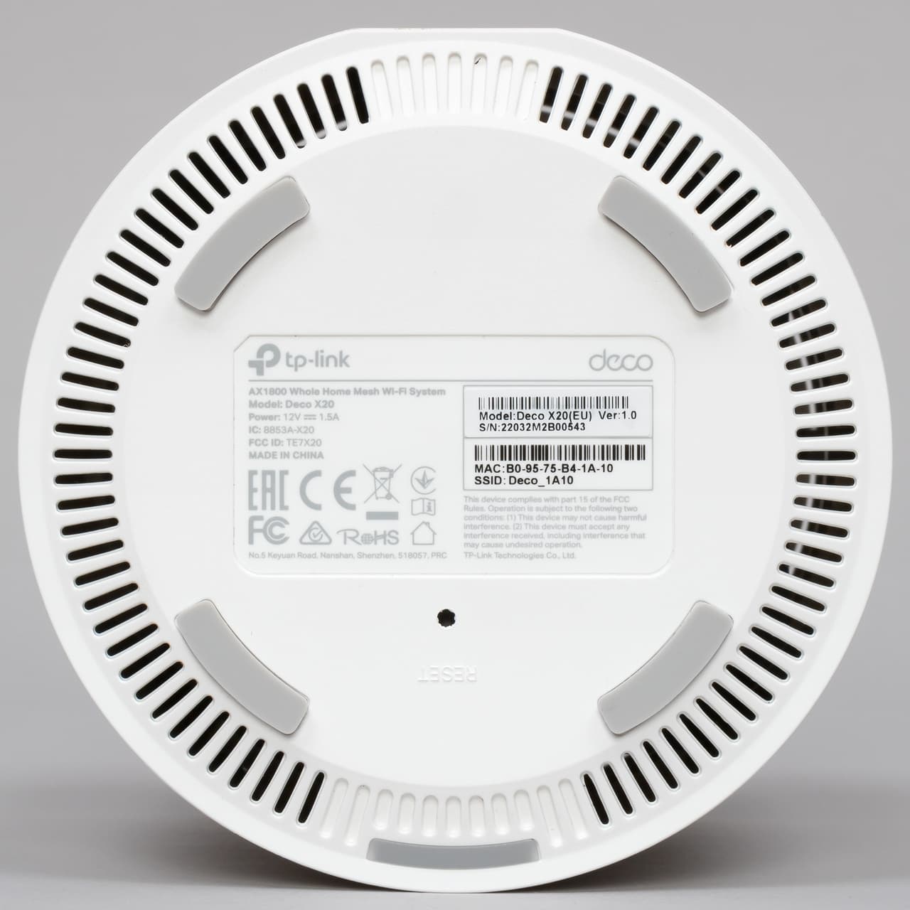 Также на дне по краю мы видим решетку вентиляции, в центре находится информационная наклейка (модель, серийный номер, MAC, SSID), а рядом с ней — скрытая кнопка сброса. Кстати, здесь же спрятали и индикатор состояния — во время работы он будет не очень ярко подсвечивать поверхность, на которой установлено устройство.