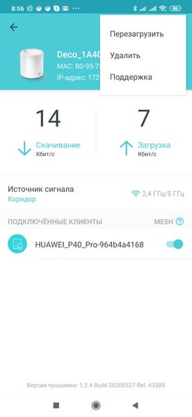 Скорости подключения в данном случае составили 400 и 867 Мбит/с для диапазонов 2,4 и 5 ГГц соответственно, поскольку, как мы говорили ранее, в узлах Deco X20 используется конфигурация с двумя антеннами. С учетом этого, показанные максимальные результаты можно считать высокими — до 300 Мбит/с в 2,4 ГГц с 802.11n и более 700 Мбит/с в 5 ГГц с 802.11ac.