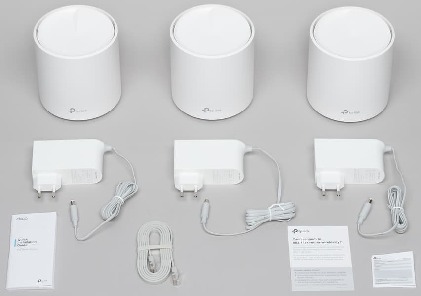 В комплект поставки набора входят: три устройства Deco X20, три блока питания к ним, один сетевой патч-корд и инструкция.