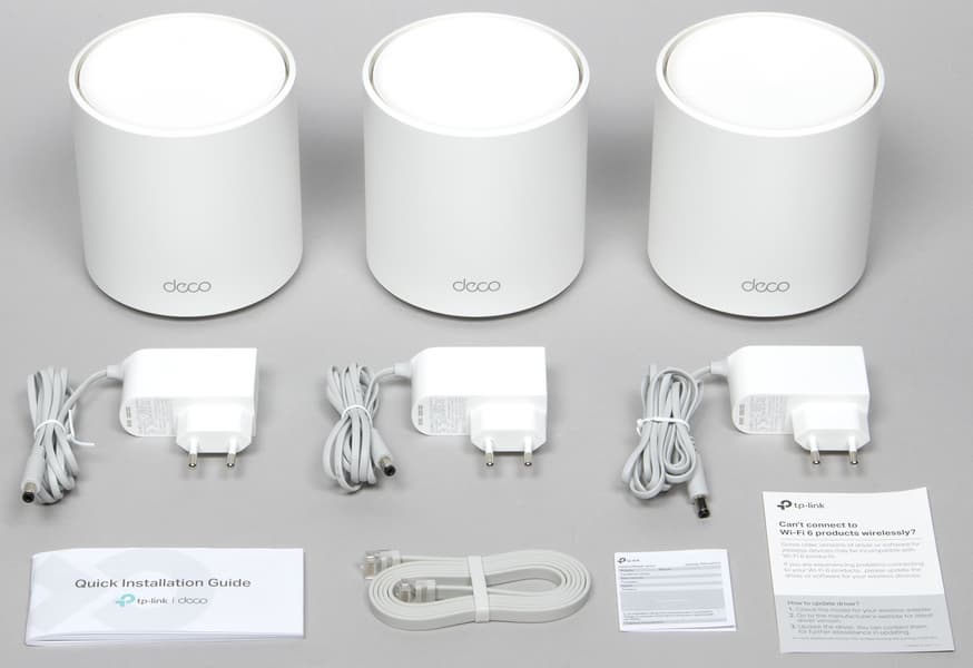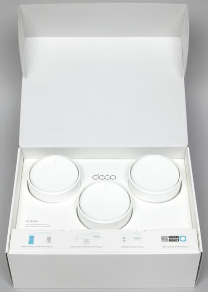 В комплект поставки входят три узла Deco X50, три блока питания для них, один патч-корд и инструкция. Узлы расставлены в достаточно свободном формате в вставке из вспененного пенопропилена.