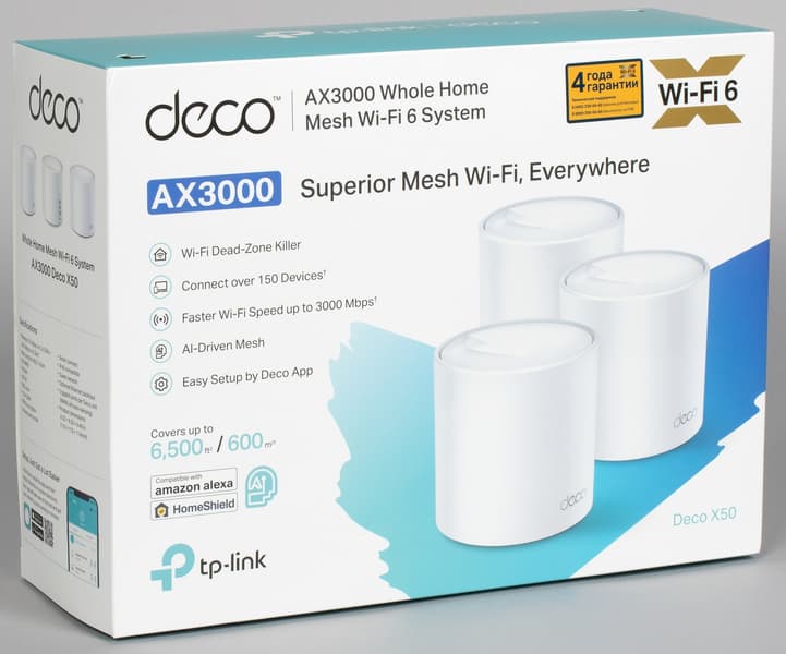 Мы уже встречались с решением серии Deco компании TP-Link пару лет назад. А сегодня познакомимся с Deco X50 класса AX3000, что означает поддержку Wi-Fi 6 (802.11ax), а также максимальные скорости подключения 2402 Мбит/с в 5 ГГц и 574 Мбит/с в 2,4 ГГц. Для данной модели заявлена возможность покрытия площади в 600 м² тремя узлами и поддержка до 150 клиентов. Из других характеристик отметим наличие трех гигабитных проводных портов на каждом узле, набор сервисов защиты TP-Link HomeShield, управление через мобильное приложение и облачный доступ.