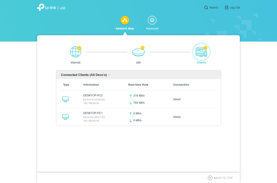 В списке клиентов предусмотрена группировка по узлу подключения. А для каждого устройства показывается его имя, MAC- и IP-адрес, тип подключения, текущие скорости загрузки и передачи.