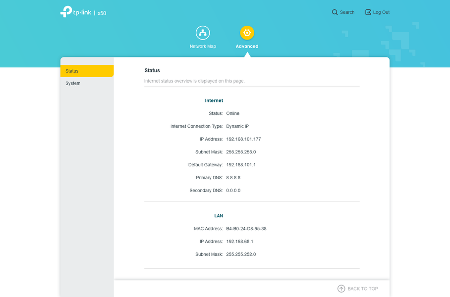 Раздел «Advanced», несмотря на громкое название, нельзя использовать для полноценной настройки системы. На странице «Status» отображается информация о сетевых адресах.