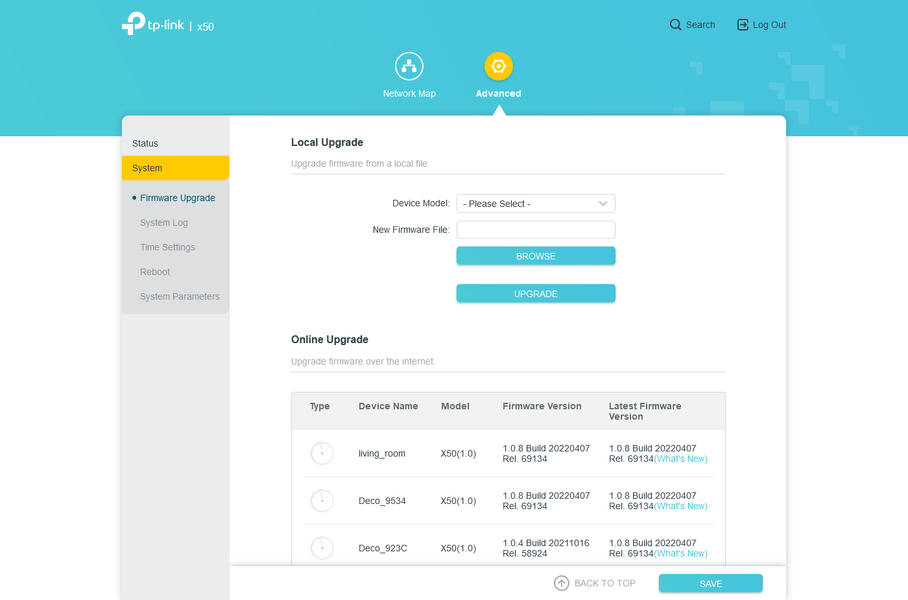 В группе «System» есть несколько страниц: обновление прошивки из файла или онлайн для любого узла сети, просмотр/очистка/скачивание системного журнала, настройка часов (точнее выбор региона для корректной синхронизации через интернет), перезагрузка любого узла сети, а системные параметры ограничены здесь парой галочек, относящихся к параметрам сетевых протоколов.