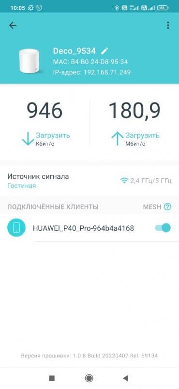 Мы видели выше, что в небольших помещениях даже один узел TP-Link Deco X50 обеспечивает отличную производительность, так что тестирование именно режима Mesh-сети в этих условиях имеет мало практического смысла. Но оценить «потери» на разделяемую полосу все-таки стоит. Для последнего теста мы установили второй узел системы в точку «4 метра через одну стену» с подключением к основному роутеру без проводов, а клиент работал в точке «8 метров через две стены». Контроль того, что клиент подключался именно ко второму узлу, осуществлялся через мобильное приложение. Возможность проконтролировать способ (диапазон) соединения узлов между собой в данных продуктах отсутствует. В роли клиентов выступают все те же смартфоны Xiaomi Mi5 и Huawei P40 Pro.