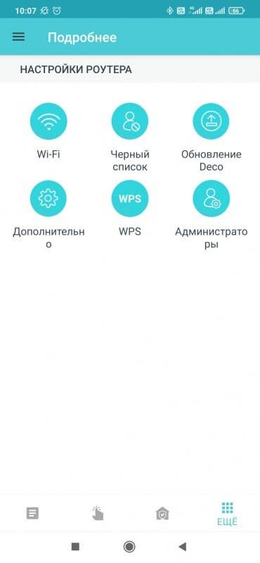 Последний значок в нижнем ряду — собственно настройки системы. Здесь мы видим шесть пунктов.В первом устанавливаются параметры работы беспроводных сетей. Обратим внимание, что возможности использования разных имен сетей для разных диапазонов здесь нет. Режимы защиты — обычные на сегодня WPA2/WPA3. Предусмотрена опция независимого отключения диапазонов. Транспортная сеть всегда использует оба диапазона (вероятно, с автоматическим выбором в зависимости от условий, проконтролировать или настроить это возможности нет). Из расширенных настроек здесь есть отключение HT160 и скрытие имени сети. Дополнительно можно включить гостевую сеть — тоже с одним именем и выбором диапазонов.