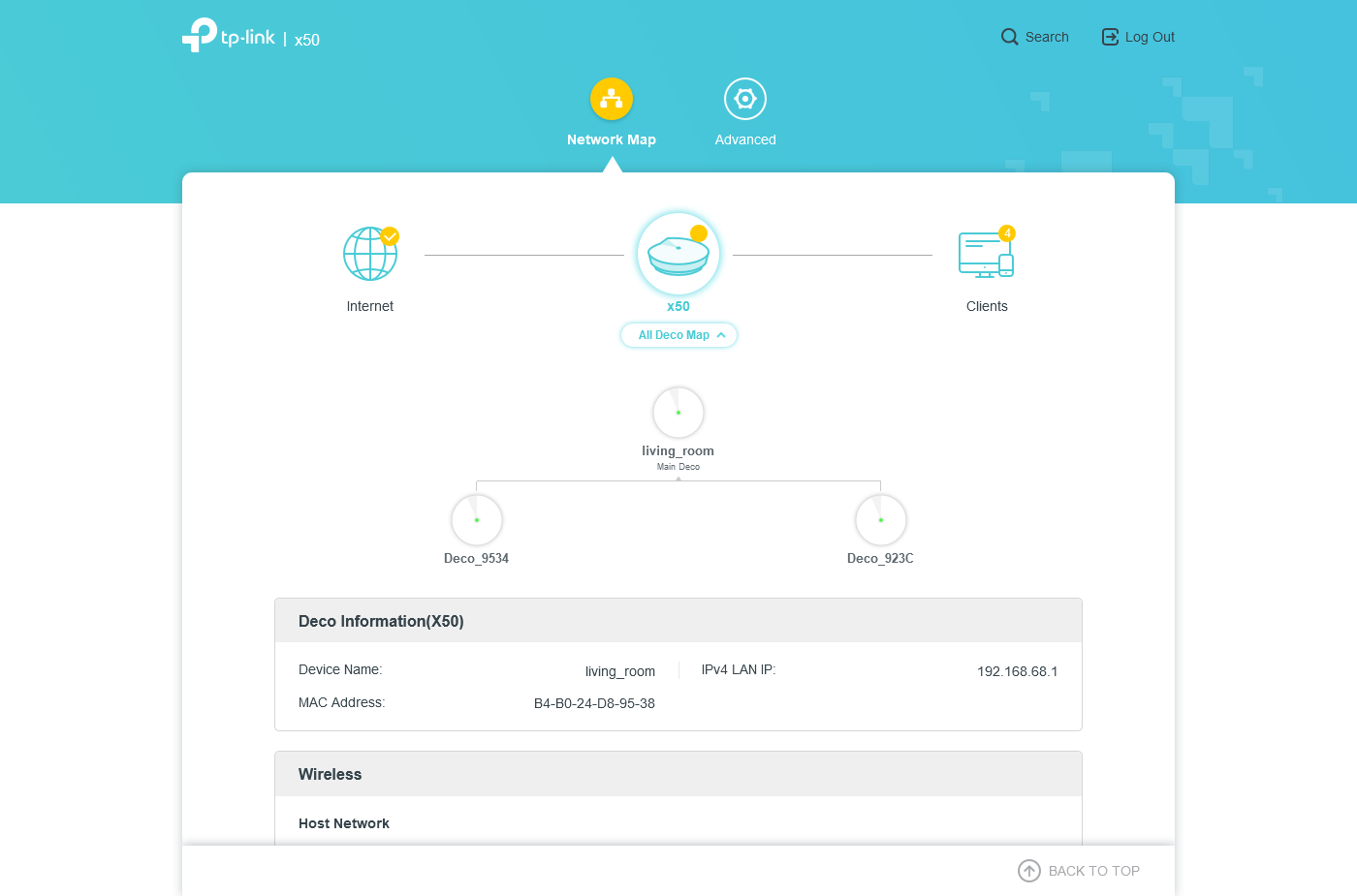 Если обратиться к главному узлу, то вы попадете на страницу «Network Map», где представлена схема сети. В частности, это статус подключения к интернету, состав Mesh-сети и клиенты. При выборе данных пунктов открываются соответствующие страницы. Для первого значка — тип подключения к интернету и сетевой адрес.