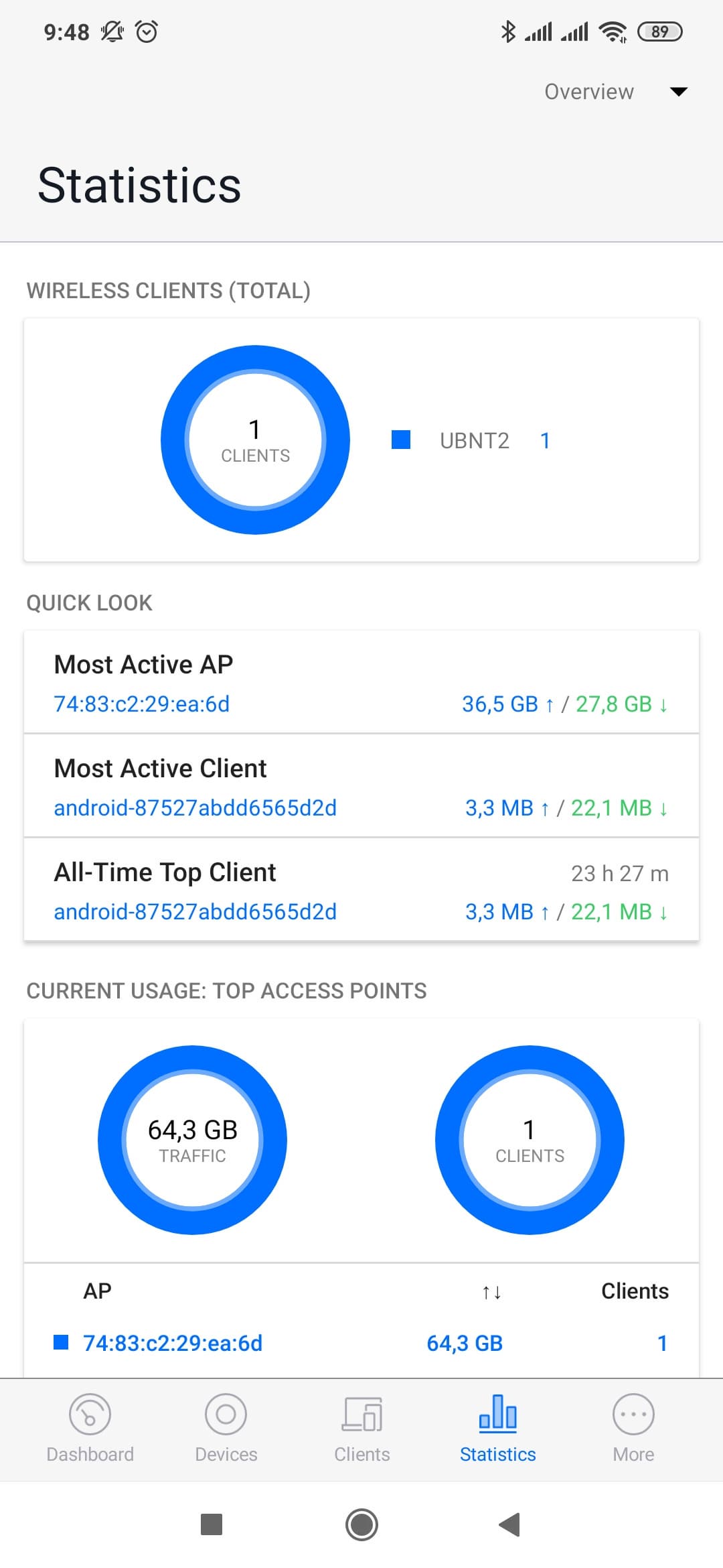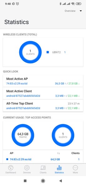 Раздел «Statistics» поможет найти наиболее активную по трафику точку доступа и клиента.