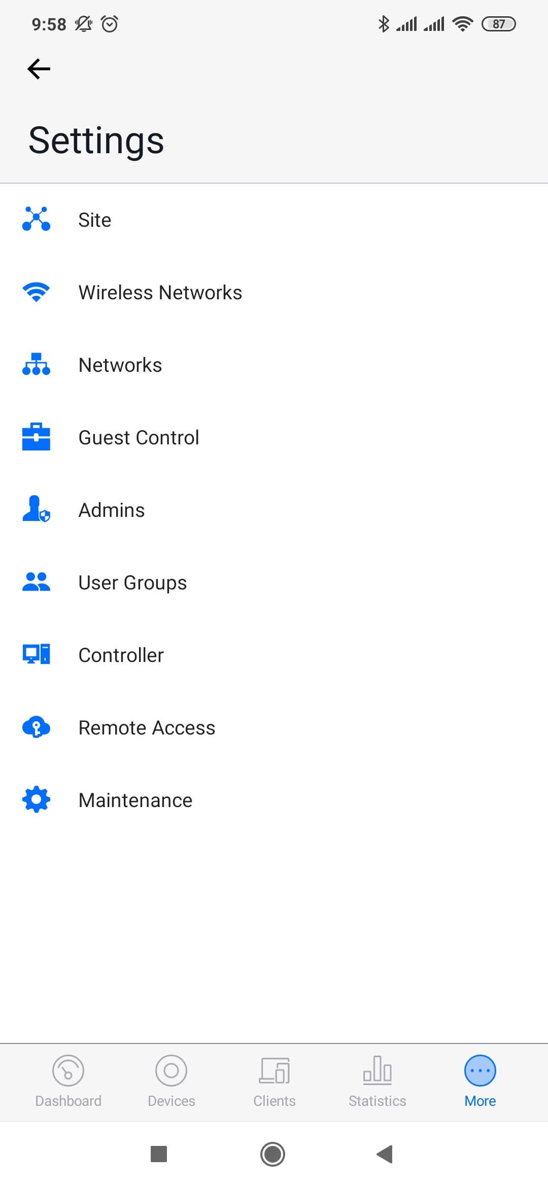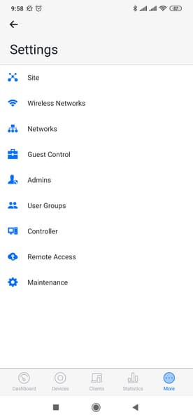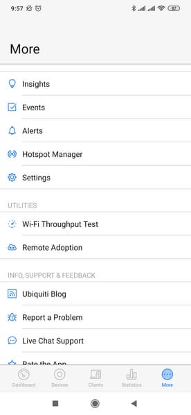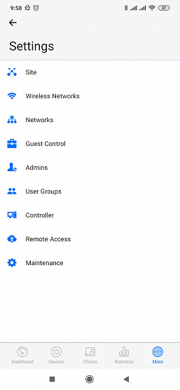 Если же требуется что-то изменить на уровне сайта, то это можно сделать на вкладке «Settings» под пунктом «More». В частности доступны настройки беспроводных сетей (редактирование, удаление, добавление), управление гостевым порталом, настройка аккаунтов администраторов контроллера, управление удаленным доступом. Полезной будет и функция теста производительности беспроводной сети, которая работает непосредственно между мобильным устройством и контроллером.