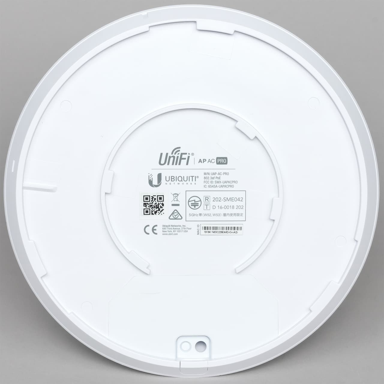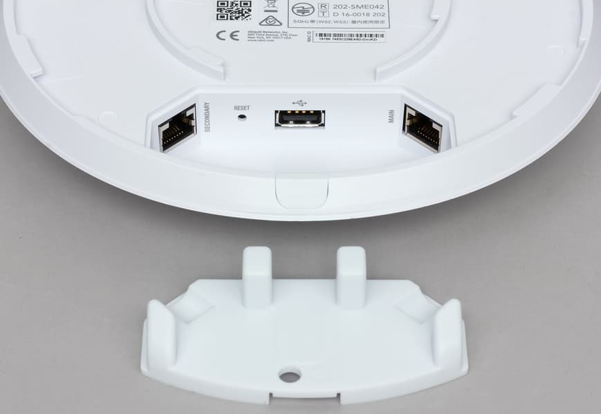 С обратной стороны находится информационная наклейка и ниша с разъемами подключения. Для AP AC Pro заявлена возможность эксплуатации и в условиях улицы, но на наш взгляд, лучше для этого использовать другие модели, в том числе и из-за диаграмм направленности встроенных антенн.