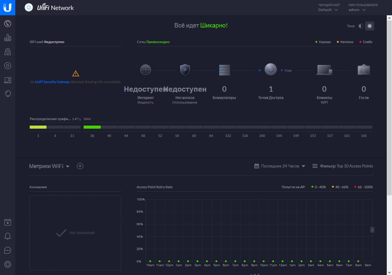 На стартовом экране отображается общая информация о сети, включая управляемые устройства и клиенты, нагрузка на каналы Wi-Fi и некоторые метрики. Как мы говорили ранее, часть функций контроллера работают только при использовании и фирменного шлюза Ubiquiti.