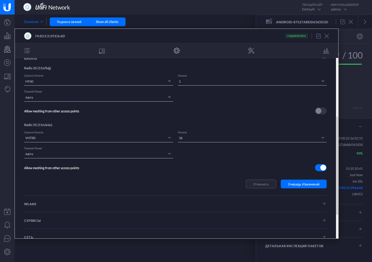 Выбранные настройки сайта автоматически транслируются на подключенные к нему точки доступа. При необходимости администратор может далее поправить требуемые параметры уже для каждой точки индивидуально.