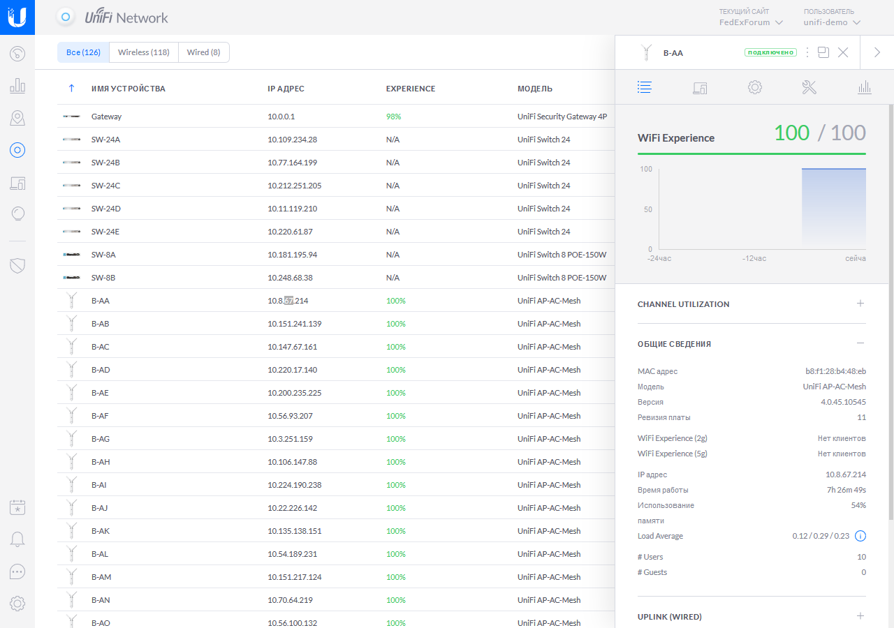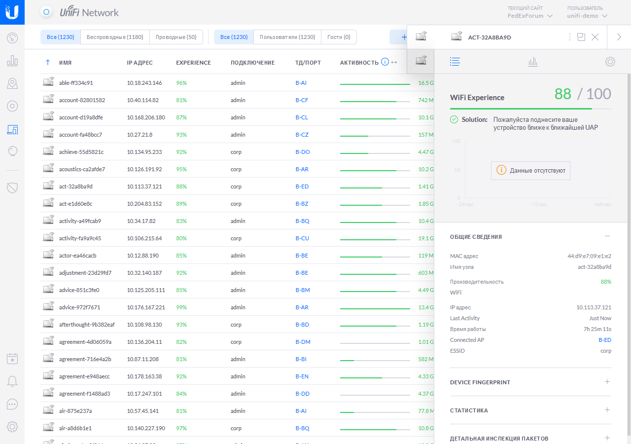 Точки доступа подключались к гигабитной локальной сети. На сайте было заведено несколько сетей с разными типами аутентификации. Использовались оба диапазона, в настойках точек доступа были указаны фиксированные номера каналов. В эфире присутствовало буквально несколько соседних сетей, так что обстановку можно было считать не очень сложной. Хотя в отчете функции Insights иногда фиксировалось и более 2000 беспроводных сетей за сутки. Для гостевого доступа применялась технология VLAN и ограничение скорости. Клиентами являлись преимущественно смартфоны, несколько планшетов, ноутбуки и разные устройства других категорий (колонки, принтеры, микроконтроллеры и т. п.).