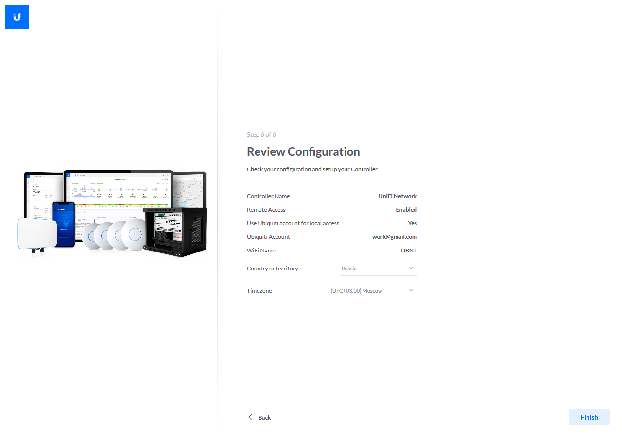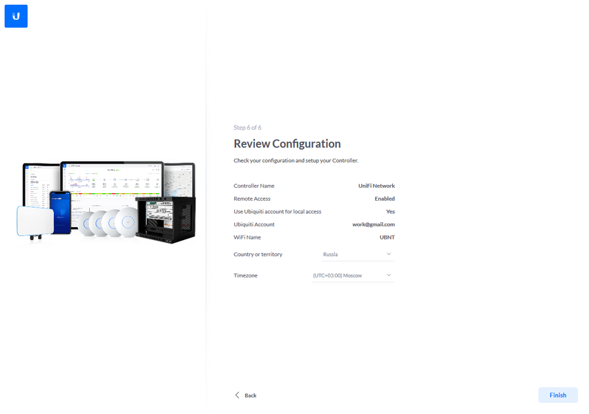 Всего в нем предусмотрено шесть шагов: выбор имени контроллера, вход в аккаунт Ubiquiti, галочки для автоматической настройки основных параметров беспроводных сетей и включения резервного копирования конфигурации по расписанию, добавление устройств, указание имени и пароля для беспроводной сети, выбор региона и часового пояса.