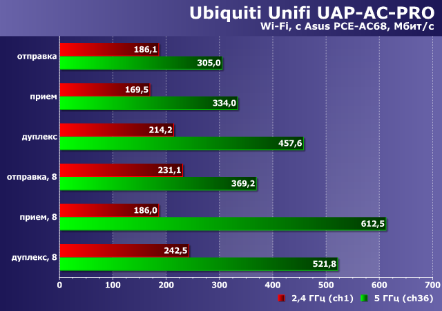Тестирование с одним клиентом проводилось совместно с ПК, в котором был установлен адаптер Asus PCE-AC68 (класс AC1900 — до 1300 Мбит/с в диапазоне 5 ГГц с 802.11ac и до 600 Мбит/с в диапазоне 2,4 ГГц с 802.11n). В диапазоне 5 ГГц использовался канал 36, а в 2,4 ГГц — канал 1. Оба варианта — с максимальной возможной шириной канала (HT80 и HT40 соответственно). В эфире присутствовало множество сетей на 2,4 ГГц и пара-тройка на 5 ГГц.
