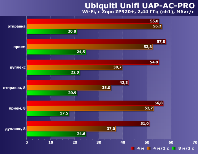 Второй тест проводился со смартфоном, оборудованным двухдиапазонным беспроводным адаптером с одной антенной и максимальными скоростями подключения 150 и 433 Мбит/с соответственно для 2,4 и 5 ГГц. Клиент располагался в трех точках — 4 метра прямой видимости, 4 метра через одну стену и 8 метров через две стены.