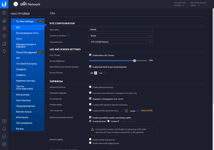 Верхним элементом всей конфигурации является сайт. Для него выбирается имя, страна (для применения региональных ограничений на Wi-Fi), время, яркость индикаторов на точках доступа, сервер сбора журналов и другие параметры. Отдельно отметим пункт активации расширенных настроек, в число которых входят Airtime fairness (оптимизация производительности при наличии медленных устройств), Bandsteering (распределение клиентов по диапазонам), Minimum RSSI (запрет подключения устройств со слабым сигналом) и другие.