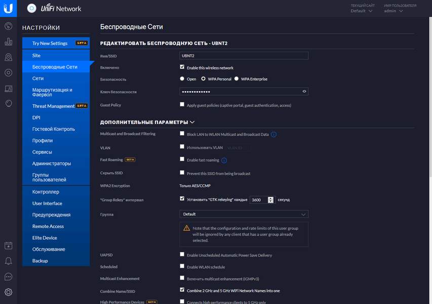 Далее на сайт вы назначаете одну или несколько беспроводных сетей. В отличие от привычных роутеров, в данном случае в основные параметры сети входят только имя и защита, а в дополнительных указываются различные опции, включая гостевой доступ, VLAN, расписание, роуминг, управление скоростью, фильтры и авторизация по MAC. Как мы видим, здесь нет выбора диапазона и канала, которые настраиваются в другом месте.
