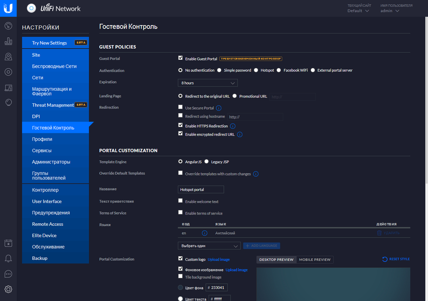 Решение поддерживает реализацию гостевого портала в различных схемах подключения. Это может быть просто уведомление, вход по общему паролю, ваучеру, через RADIUS-сервер или другие сервисы. Можно также использовать и внешние серверы для аутентификации пользователей.