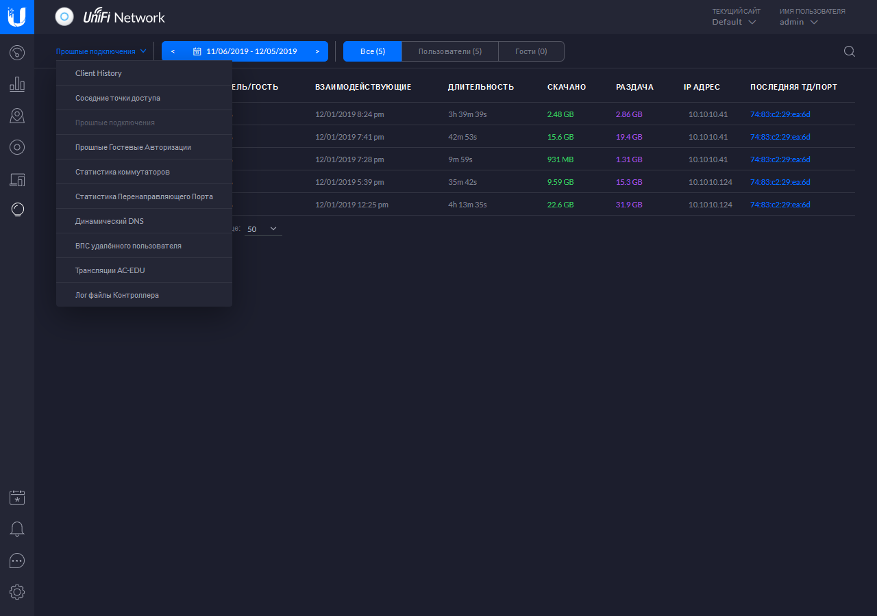 В последнем случае есть возможность выбора различных список, включая подключения клиентов, обнаружение соседних точек доступа, гостевые подключения и другие. При этом удобно смотреть и историю, выбирая требуемые даты.
